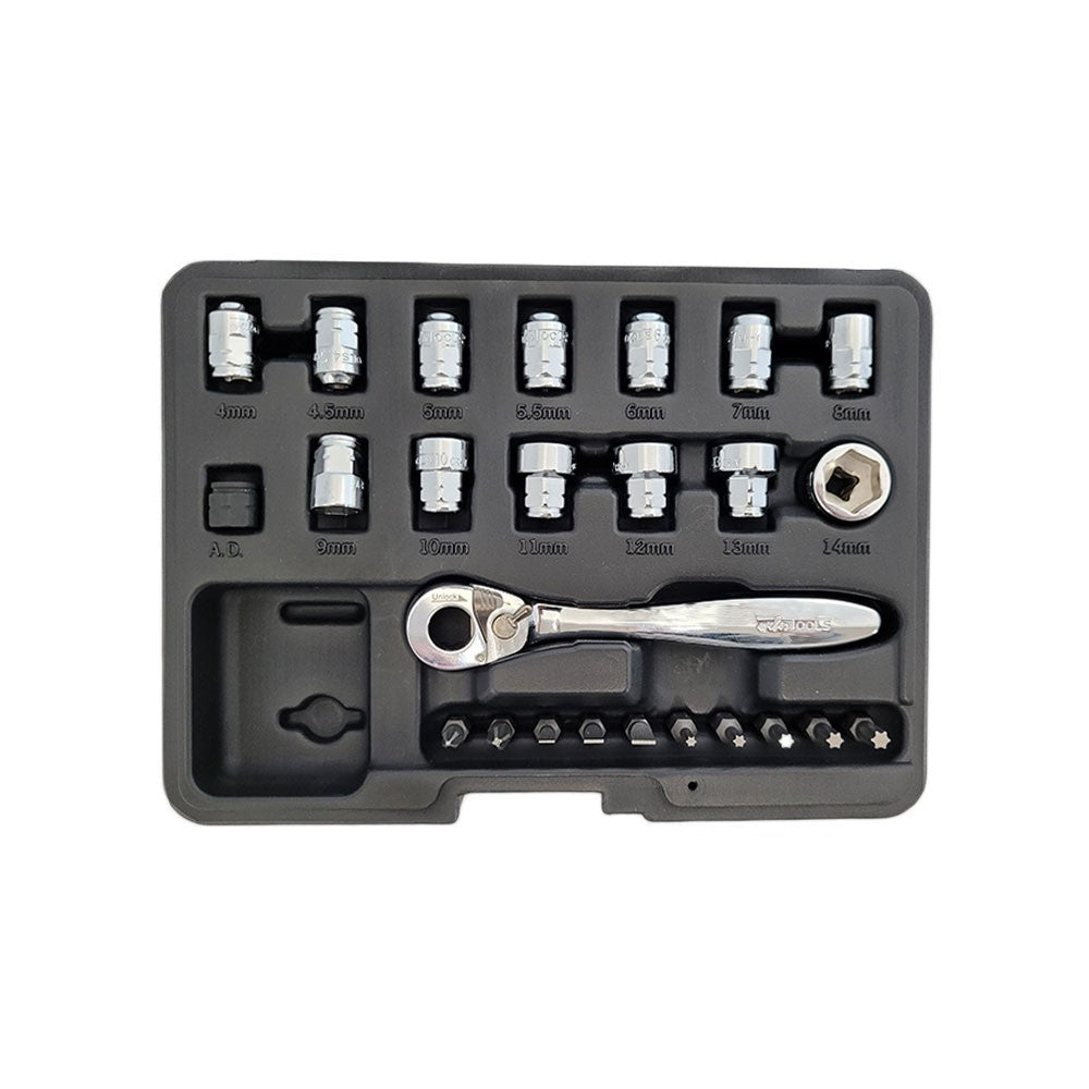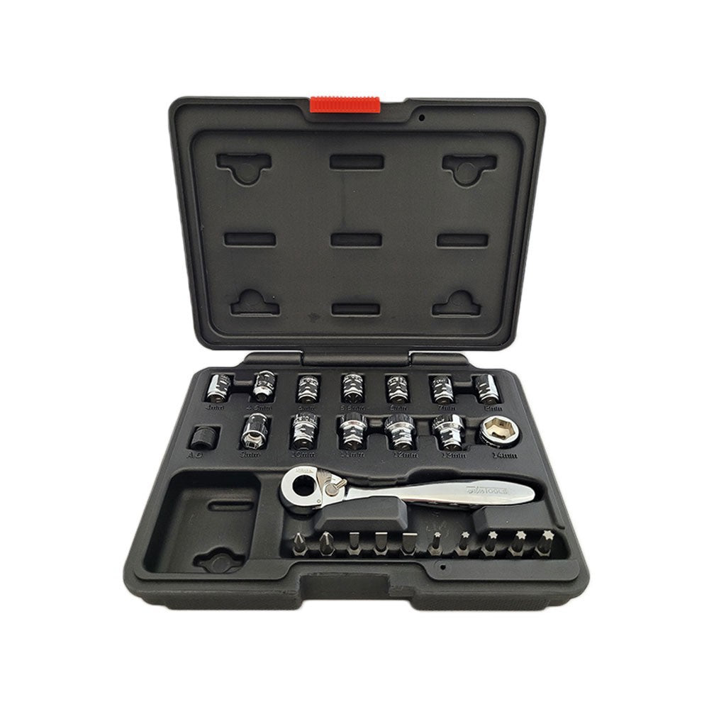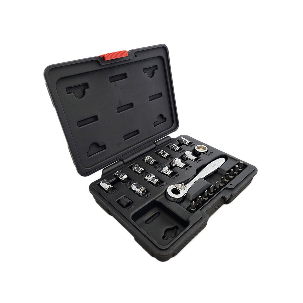 Ontdek onze veelzijdige 1/4'' Doppenset van 25-delen, de ideale keuze voor zowel de professionele monteur als de enthousiaste doe-het-zelver. Deze zorgvuldig samengestelde set is ontworpen voor gebruik in smalle ruimtes, waar precisie en toegankelijkheid van groot belang zijn. Met een uitgebreide selectie van 1/4'' 6-kant doppen in de maten van 4 mm tot 14 mm, biedt deze set de perfecte oplossing voor een breed scala aan toepassingen.