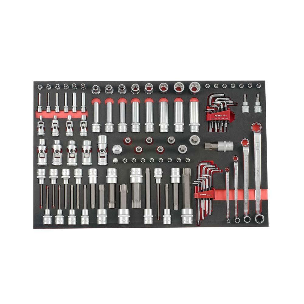 De afmetingen van de set zijn L 57CM x B 37,5CM x H 3CM, wat zorgt voor een optimale indeling en organisatie van de doppen. De set bevat een uitgebreide selectie van 1/4” en 1/2” doppen in verschillende maten, waaronder E-torx, Torx en Resistorx. Van de lange E-torx doppen (E4 tot E10) tot de stevige 1/2" Torx stiftdoppen (T20 tot T100), u vindt altijd het juiste gereedschap voor uw klus.