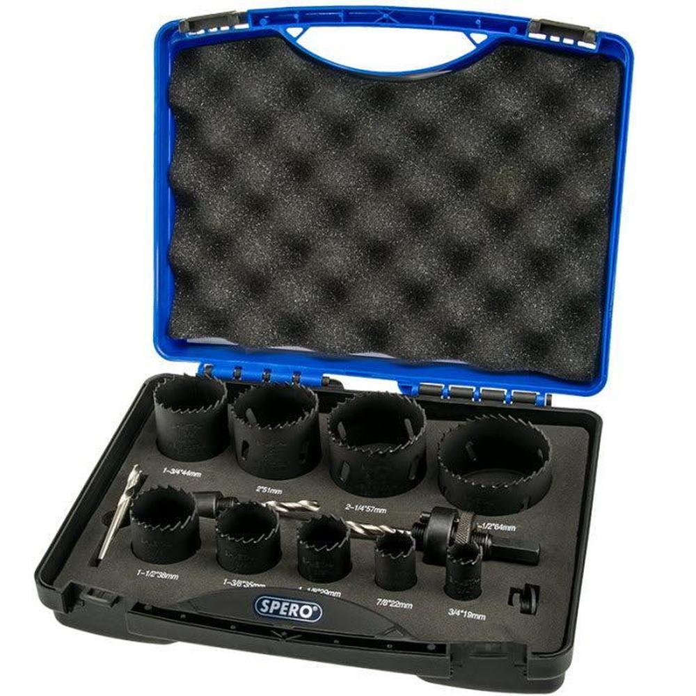 Professionele 13 delige gatenzaag in PVC koffer met de meest courante boormaten voor een monteur. De boren zijn van Bi-metaal met geharde tanden van hoog gelegeerd sneldraaistaal. Bestaande uit boormaten 19, 22, 29, 35, 38, 44, 51, 57, 64mm met boorhouder 14-30mm & 32-210mm en verloopadapter. Deze set is van zeer hoogwaardig materiaal en beschikt over een extra dikke bodemplaat voor uiterst stabiel zagen. Tevens is de eerste 8mm van gehele boven rand bij de tanden ook gehard wat garant staat voor een lange levensduur. Deze zagen zijn geschikt voor, RVS-staal, gietijzer, aluminium, koper, hout, gipsplaten en kunststof.