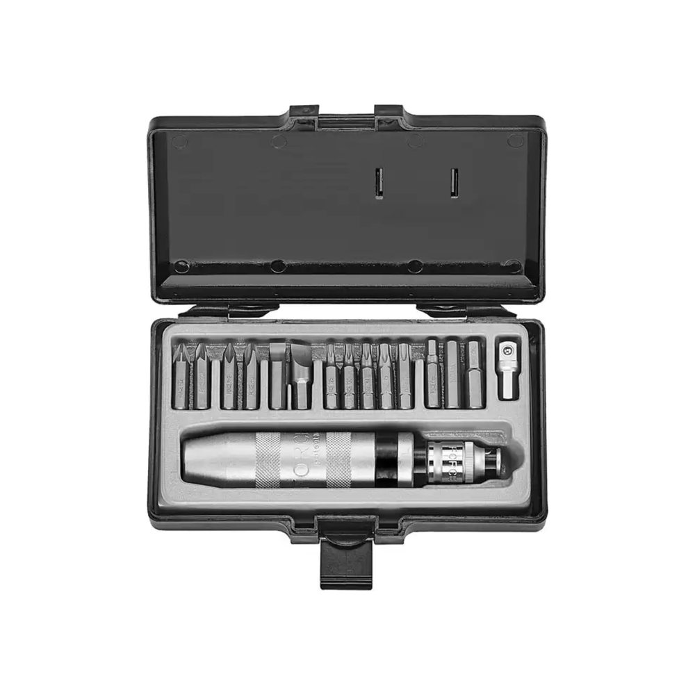 Ontdek de ultieme oplossing voor al uw zware klussen met onze 17-delige slagmoersleutelset. Dit hoogwaardige gereedschap is ontworpen om met gemak hardnekkige schroeven en bouten los te krijgen die anders onmogelijk te verwijderen zouden zijn. De slagmoersleutel werkt door middel van een innovatieve technologie die een neerwaartse beweging omzet in een krachtige zijdelingse kracht, waardoor de schroef of bout als het ware 'schrikt' en gemakkelijk loskomt. Dit vermindert het risico op het 'doldraaien' van schroeven, wat vaak voorkomt bij traditionele schroevendraaiers.