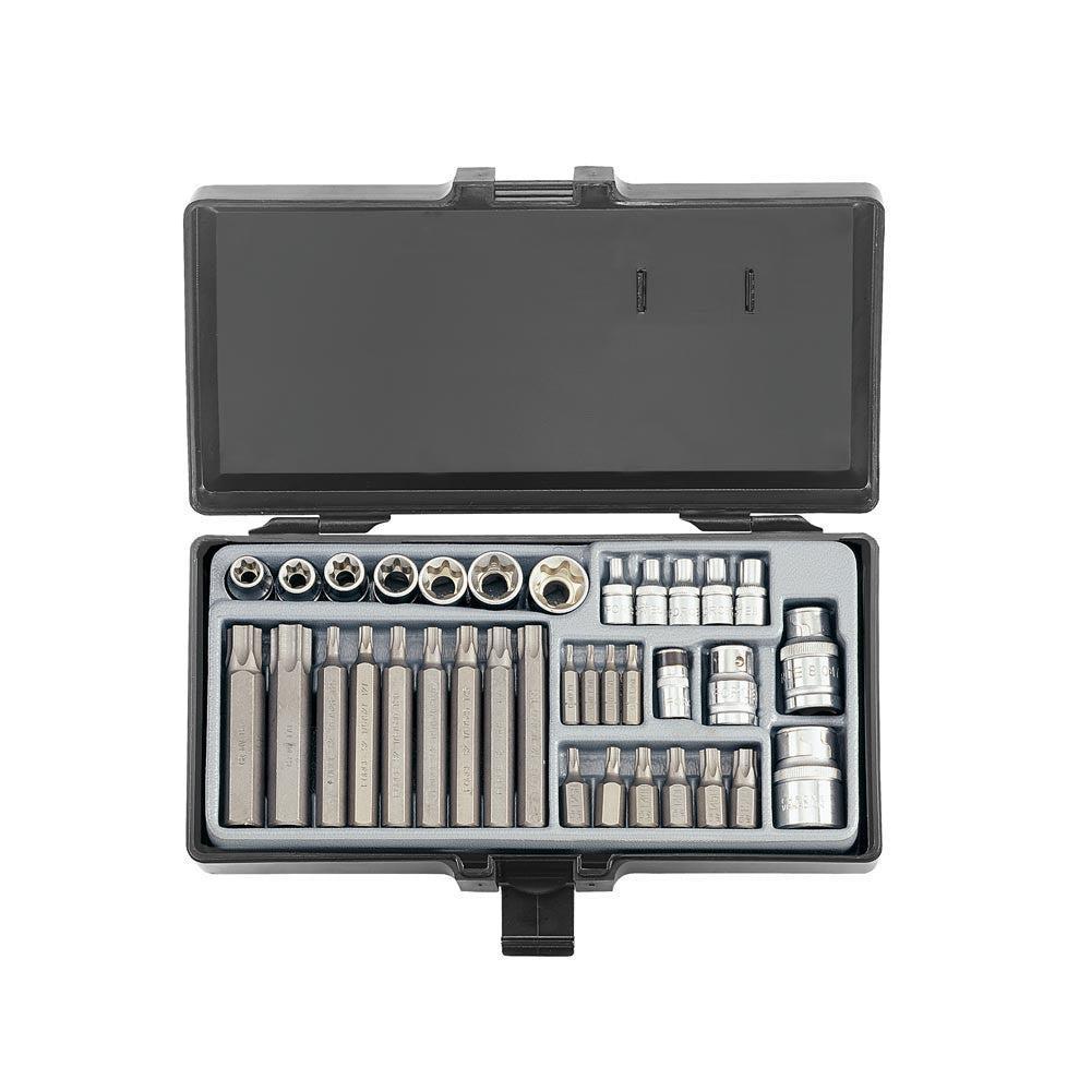 De 35pc Star set is de perfecte oplossing voor iedere klusser, hobbyist en professional die op zoek is naar een uitgebreide en veelzijdige dopsleutelset. Deze set bevat in totaal 35 handige onderdelen, allemaal ontworpen voor het eenvoudig en efficiënt werken met torx- en e-torx-schroeven. Of je nu aan een auto werkt, meubels monteert of apparaten repareert, deze set biedt alles wat je nodig hebt.