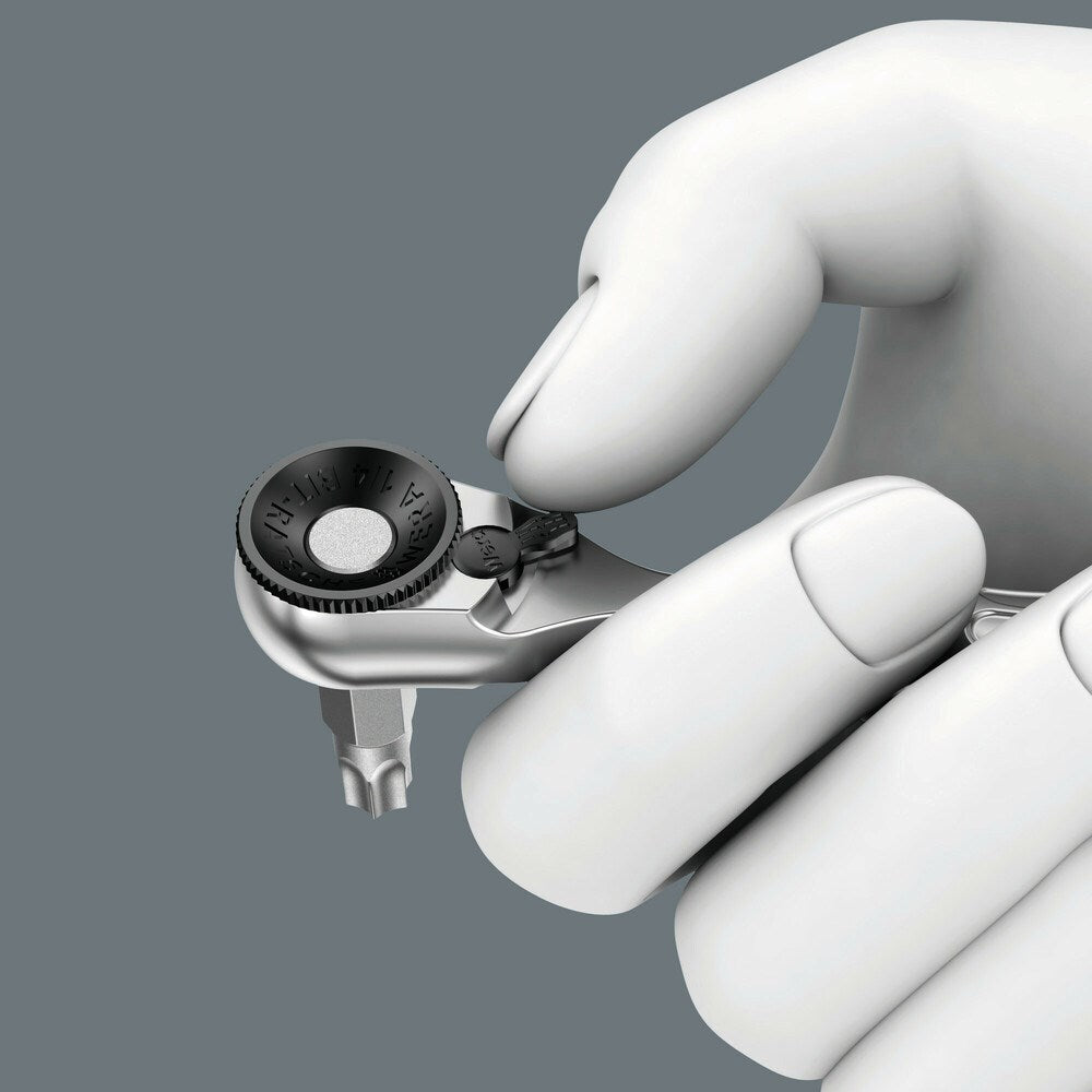 De Wera bit-ratel. Eenvoudig te bedienen, zelfs met 1 hand op lastige schroeflocaties. Smeedijzeren uitvoering. Fijnvertand mechaniek (60 tanden) voor een kleine terughaalhoek van 6° voor nauwkeurig werken. Het geribde wieltje maakt snel schroeven op lastige schroeflocaties mogelijk, als geen ratel kan worden gebruikt. Eenvoudige links/rechts-omschakeling. Ergonomisch gevormde ratelkop en -hendel. Voor 1/4" bit- en dopopname.