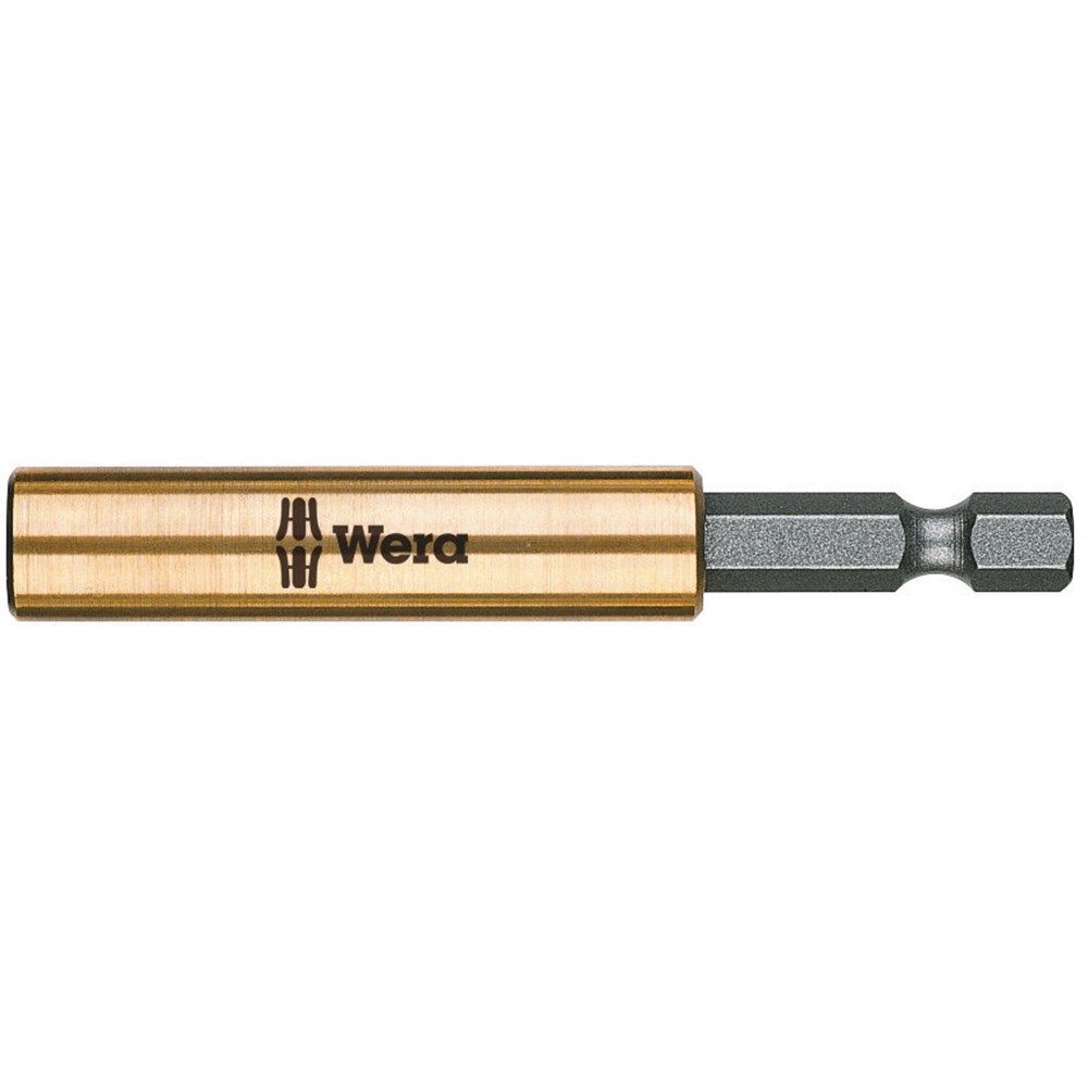 Universele houder geschikt voor plaatsing van bits met 1/4" buitenzeskant-aandrijving conform DIN ISO 1173-C 6,3. De veerring zorgt voor een optimale bevestiging van het gereedschap in de houder. De krachtige permanente magneet houdt de bits muurvast in het gereedschap. De koper/beryllium-huls is uitermate geschikt voor schroefwerkzaamheden met zeer hoge draaimomenten of belastingspieken en is uiterst bestendig tegen corrosie. 1/4" zeskant, passend in schroefmachines met opname conform DIN ISO 1173-F 6,3.