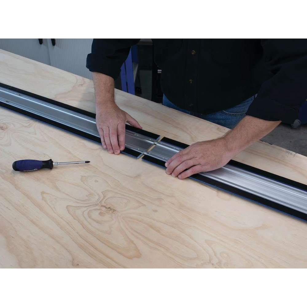 Transformeer simpelweg uw Accu-Cut™ in een high-performance geleidingssysteem van 100 inch door de twee geleiderails aan uw toestel te koppelen wanneer u langere sneden wilt maken. Neem uw zaag en het track systeem mee naar uw werkstuk en maak sneden van elke lengte – waar dan ook.