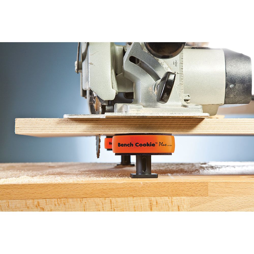 Hoge wrijving rubberen kussen houden projecten stabiel tijdens het zagen, schuren of frezen zonder klemmen te gebruiken. Er is een inzetstuk met schroefdraad meegeleverd voor het toevoegen van verschillende accessoires die uw werk een boost geven en voldoende ruimte bieden voor alle projectbehoeften. Optionele accessoires beschikbaar voor de Bench Cookie® Plus: Bench Cookie® werk grijpers, Bench Cookie® schraagklemmen, Bench Cookie® bruggen en Bench Cookie® afstandhouders.