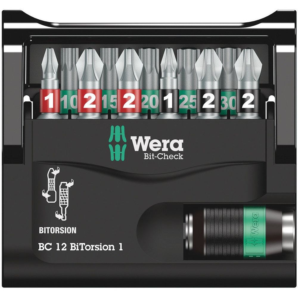 Extreem harde bits, voor universeel gebruik. BiTorsion-bits met torsiezone, waarin bij belastingspieken kinetische energie wordt afgeleid. Hierdoor wordt de levensduur van het product aanzienlijk hoger. Met bijpassende houder ter verlenging van de levensduur. Voorzien van Rapidaptor-technologie, om de bits te kunnen plaatsen zonder daartoe de huls te moeten bedienen. Om de bits weer te verwijderen, hoeft u de huls slechts naar voren te schuiven - zo kunt u bits zelfs met 1 hand razendsnel wisselen. Voor plaatsing van bits met 1/4" buitenzeskant-aandrijving conform DIN ISO 1173-C 6,3 en E 6,3. Voor plaatsing in de schroefboormachine of in boorkop van een elektronisch geregelde boormachine. De meerdelige Bit-Check overtuigt door het lage gewicht en uitstekende compactheid. Daarbij zorgt het zachte materiaal in het onderste gedeelte van de Bit-Check voor een betere houvast voor de bits en maakt tegelijk het uitnemen daarvan makkelijker. Het profiel en het formaat van de bits zijn gemakkelijk te herkennen dankzij de Wera 'Take it easy'-Toolfinder met kleurcodering en duidelijk zichtbare beschrijving.