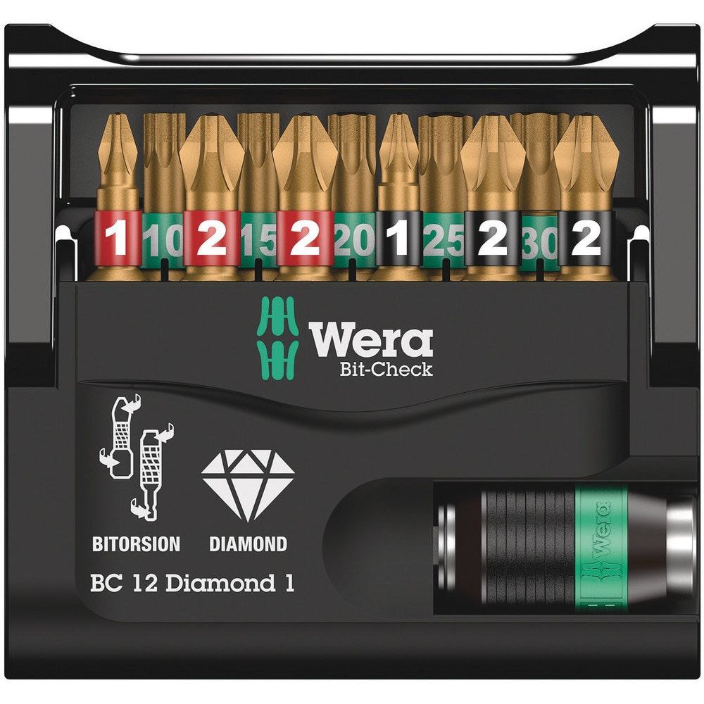 Bits met minuscule diamantdeeltjes op bitpunt. Deze zorgen voor een veilige grip op de schroef, verkleinen de vereiste aandrukkracht en reduceren het risico op wegglijden. BiTorsion-bits met torsiezone, waarin bij belastingspieken kinetische energie wordt afgeleid. Hierdoor wordt de levensduur van het product aanzienlijk hoger. Voorzien van Rapidaptor-technologie, om de bits te kunnen plaatsen zonder daartoe de huls te moeten bedienen. Om de bits weer te verwijderen, hoeft u de huls slechts naar voren te schuiven - zo kunt u bits zelfs met 1 hand razendsnel wisselen. Voor plaatsing in de schroefboormachine of in boorkop van een elektronisch geregelde boormachine. De meerdelige Bit-Check overtuigt door het lage gewicht en uitstekende compactheid. Daarbij zorgt het zachte materiaal in het onderste gedeelte van de Bit-Check voor een betere houvast voor de bits en maakt tegelijk het uitnemen daarvan makkelijker. Het profiel en het formaat van de bits zijn gemakkelijk te herkennen dankzij de Wera 'Take it easy'-Toolfinder met kleurcodering en duidelijk zichtbare beschrijving.