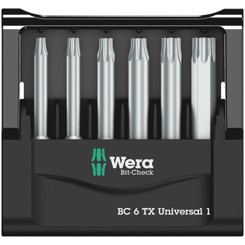 6 50 mm lange Wera TORX® bits, overzichtelijk en compact gerangschikt in handige Bit-Check. Met extreem harde bits, voor universeel gebruik.