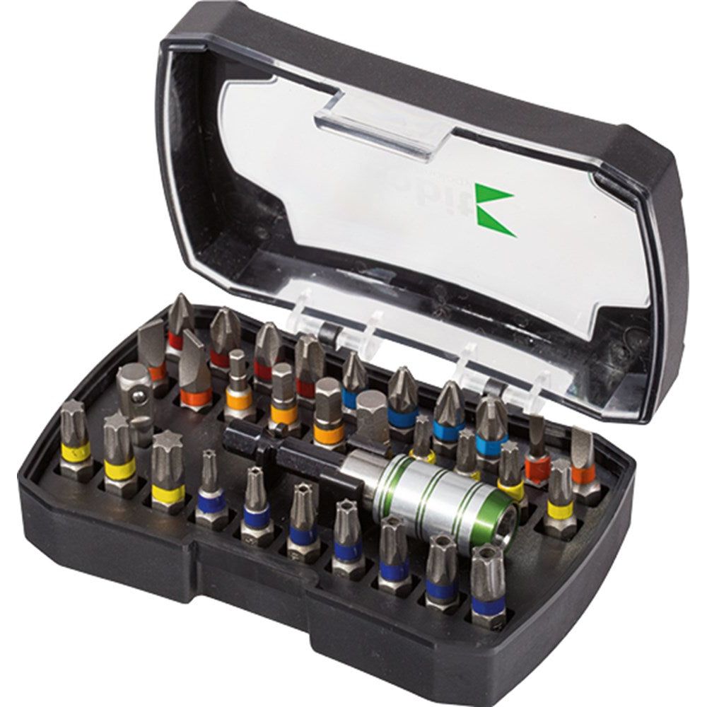De set bestaat uit maar liefst 32 delen, waaronder 30 bits met een lengte van 25 mm en een 60 mm lange bithouder, allemaal verpakt in een stevige kunststof box die perfect is voor opslag en transport. De bits zijn uitgerust met een handige kleurcodering, waardoor je snel en eenvoudig de juiste bit kunt selecteren, zonder tijd te verspillen aan zoeken.