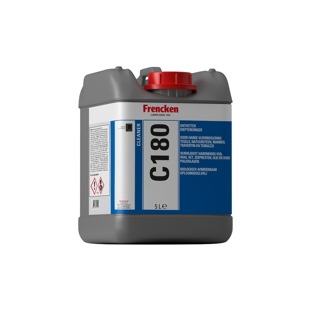 Ontdek de kracht van de C180 – Vloerreiniger in een handige kan van 5 liter, de ideale keuze voor het grondig reinigen en ontvetten van al uw harde vloerbekleding. Deze milieuvriendelijke, alkalisch geconcentreerde dieptereiniger is speciaal ontwikkeld om alle soorten harde vloeren een frisse uitstraling te geven en tegelijkertijd de natuurlijke schoonheid te behouden.