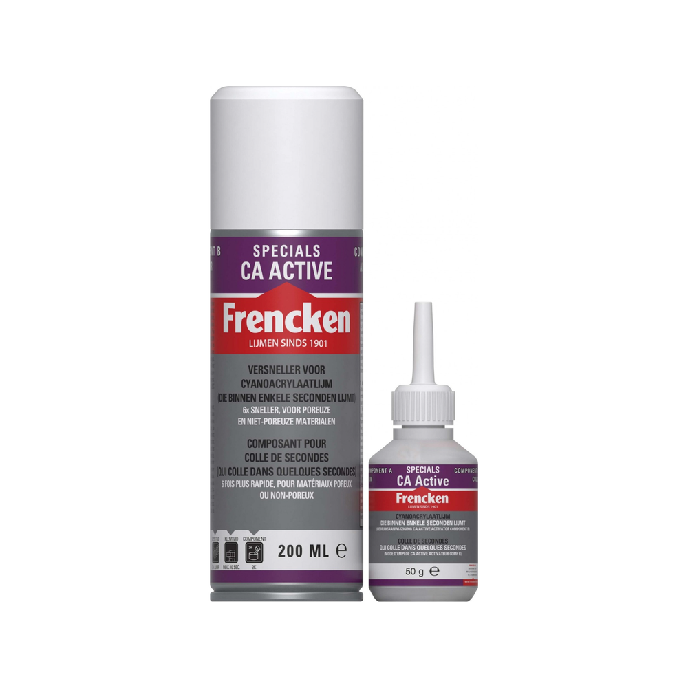 CA Active is een secondenlijm op basis van cyano acrylaat die in combinatie met de bijgeleverde activator binnen enkele seconden een sterke lijmverbinding tot stand brengt. CA Active heeft een zeer breed toepassingsgebied. Door de activator is de CA Active minder afhankelijk van aanwezig vocht en daarmee geschikt om niet poreuze materialen te verlijmen.