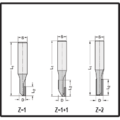| Toepassing: n = 18.000 - 24.000 min-¹ Vf = 4 - 8 m/min. Niet geschikt voor zwaar freeswerk en frezen in massief hout. |