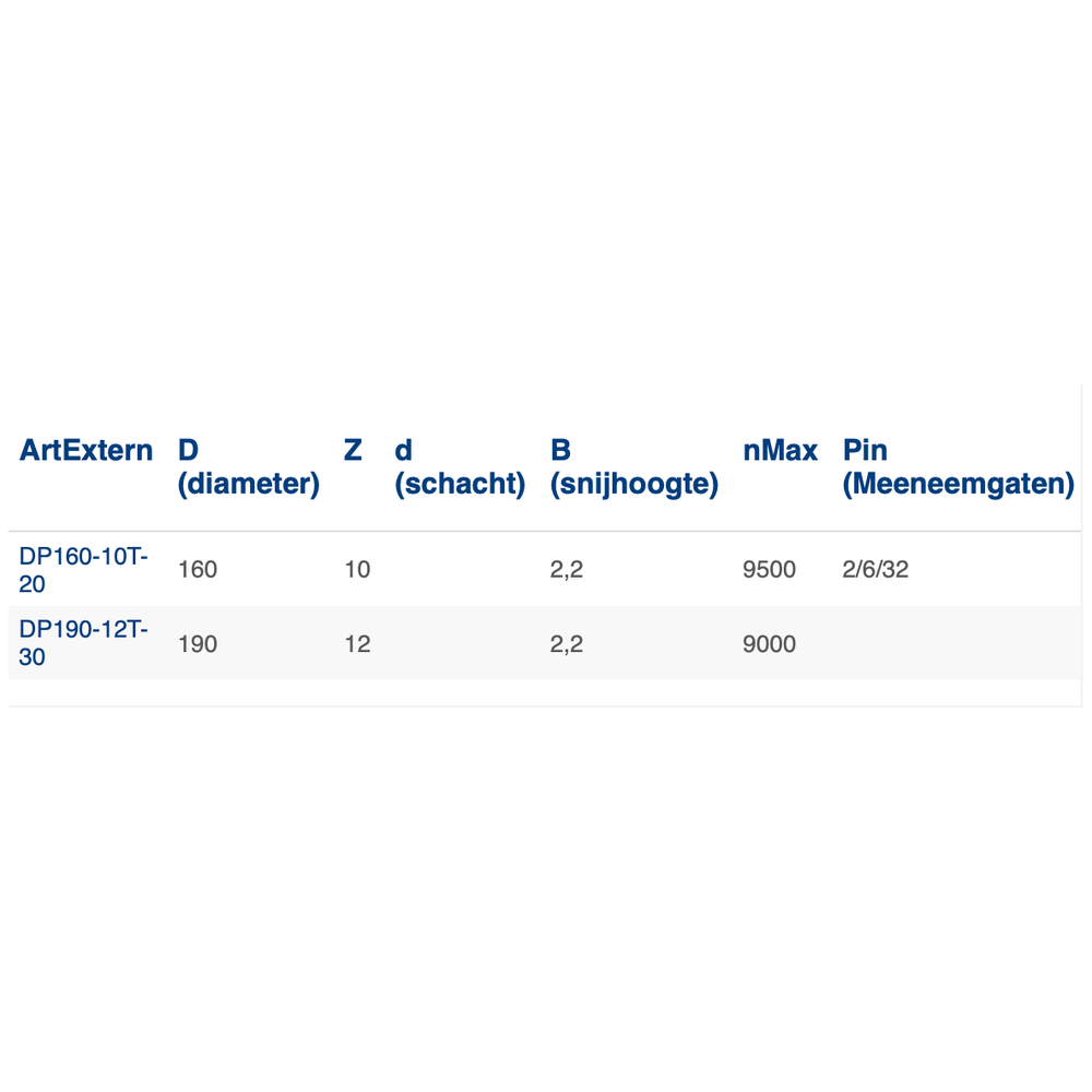Toepassing: dikte tot 20mm. Geschikt voor Cementplaat en afkorten. Geschikt voor extreem slijtende materialen als Eternit, gips, glasvezelplaat, Heraklith, Fermacel, Rockpanel, Ornimat, Omimat, Cembrit en steenwolplaten (geen Trespa!) Niet te grote aanvoersnelheid gebruiken. Vanwege de hoge wrijving kan de soldeer smelten!
