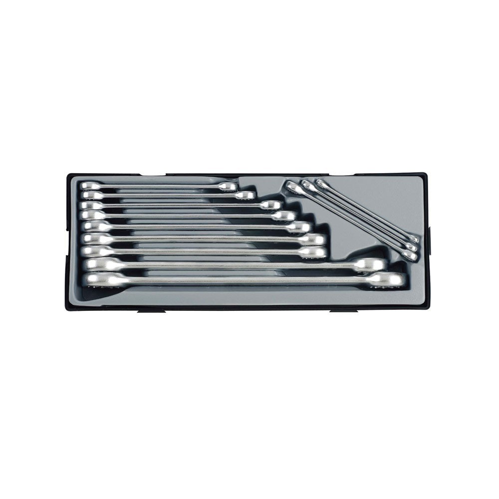 Elke ringsleutel in deze set is ontworpen met gebruiksgemak en efficiëntie in gedachten. De dubbele uitvoering biedt extra grip en controle, wat essentieel is voor het gemak van het los- en vastdraaien van moeren en bouten. Of u nu werkt aan voertuigen, machines of andere mechanische onderdelen, deze sleutels zullen uw vertrouwen in uw reparaties en onderhoud vergroten.
