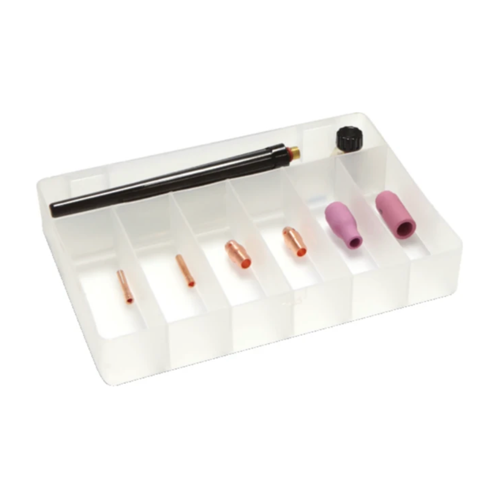 Essentiële toebehorenset voor de AC/DC SR17 en SR26 TIG-toorts in een kunststof doos.