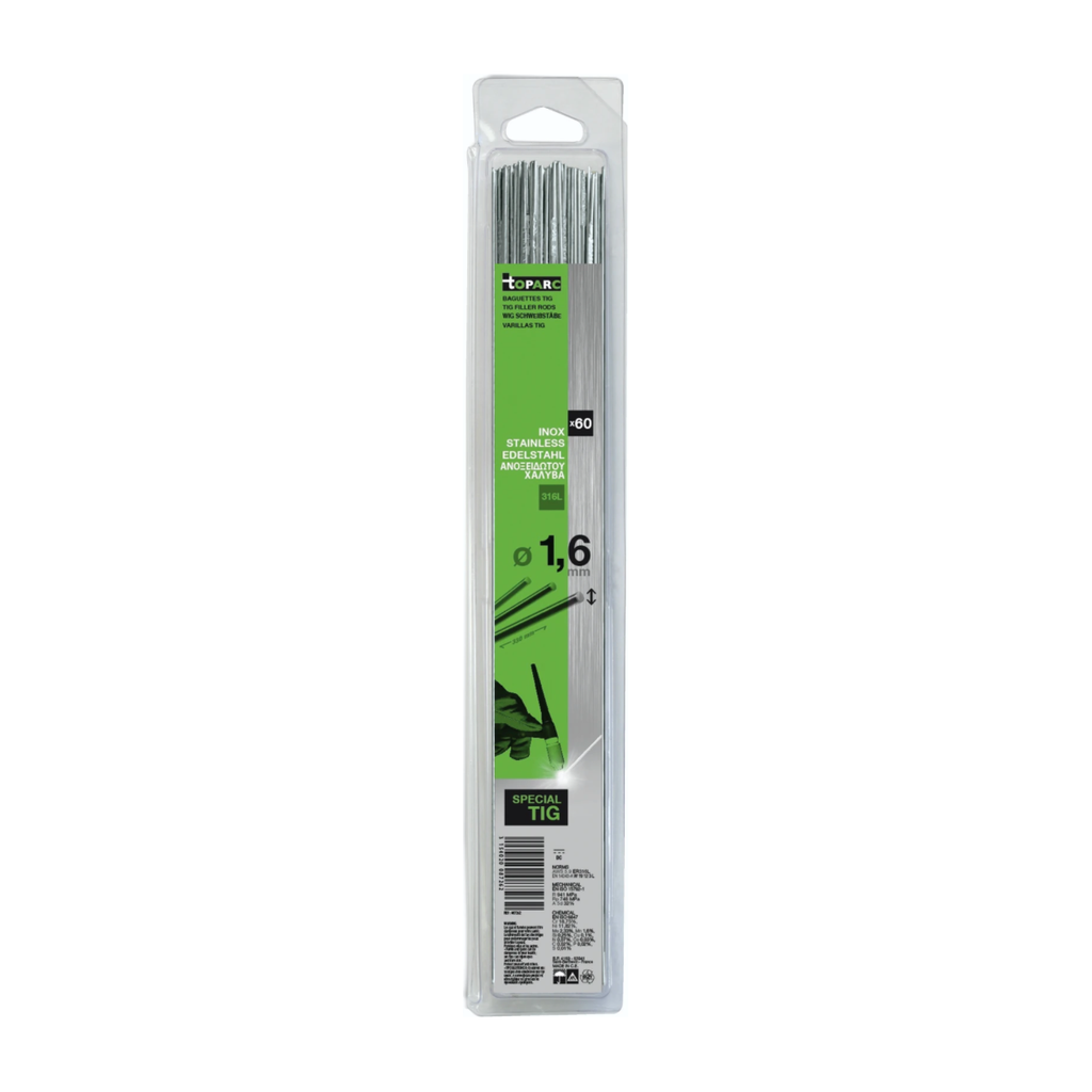 Lastoevoegmaterialen TIG Rvs 316L in staven, voor het lassen van austenitisch rvs met en zonder molybdeen (316, 316L, 316 Ti/Nb304, 304L). Aanbevolen voor de eerste passage in alle gevallen waar een regelmatige inbranding en een goede compactheid vereist zijn.