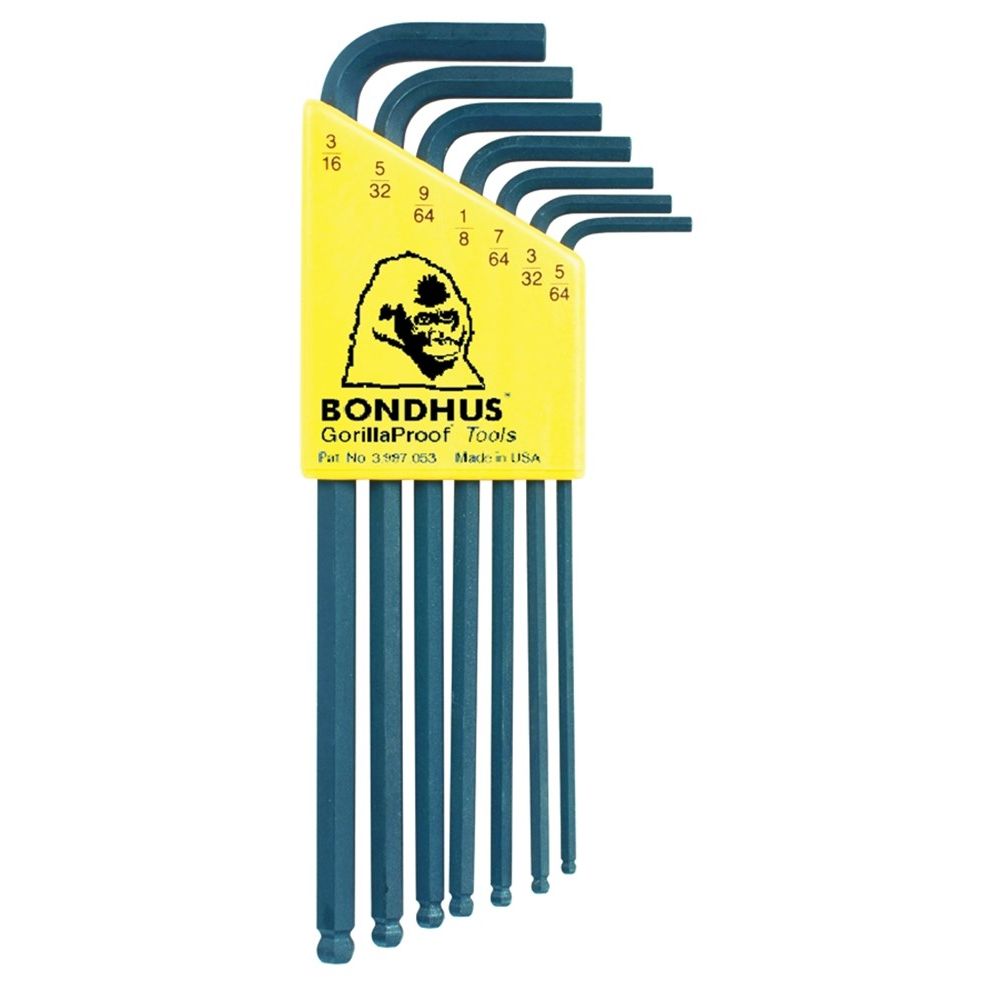 - 7 stuks stiftsleutels met kogelkop, inch: 5/64, 3/32, 7/64, 1/8, 9/64, 5/32, 3/16”
