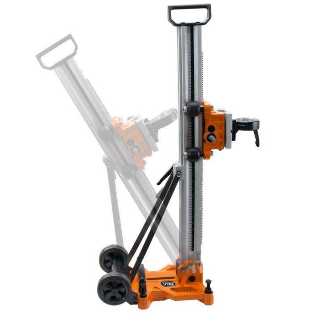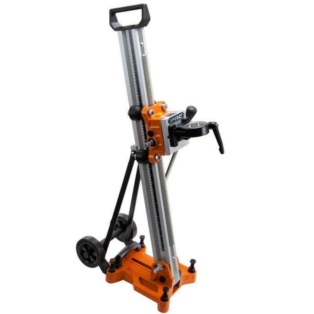 Aluminium boorstandaard voor een diamantboormachine met een compacte voetplaat, een machine snelsluiting en de mogelijkheid om te kantelen zodat in een hoek geboord kan worden. Het model de spas9001 is geschikt voor alle diamant kernboormachines met een hals aansluiting van 60mm. De halsaansluiting is eenvoudig te ontkoppelen van het statief door middel van de snelsluiting, zodat eerste het statief kan worden gemonteerd en daarna de boormotor met de halsaansluiting in de snelsluiting te plaatsen is. Op de boorhouderkast zit een waterpas/ ronde libele, voor het eenvoudig waterpas afstellen van het statief. Te gebruiken voor diamantboren met een maximale diameter van 160mm.