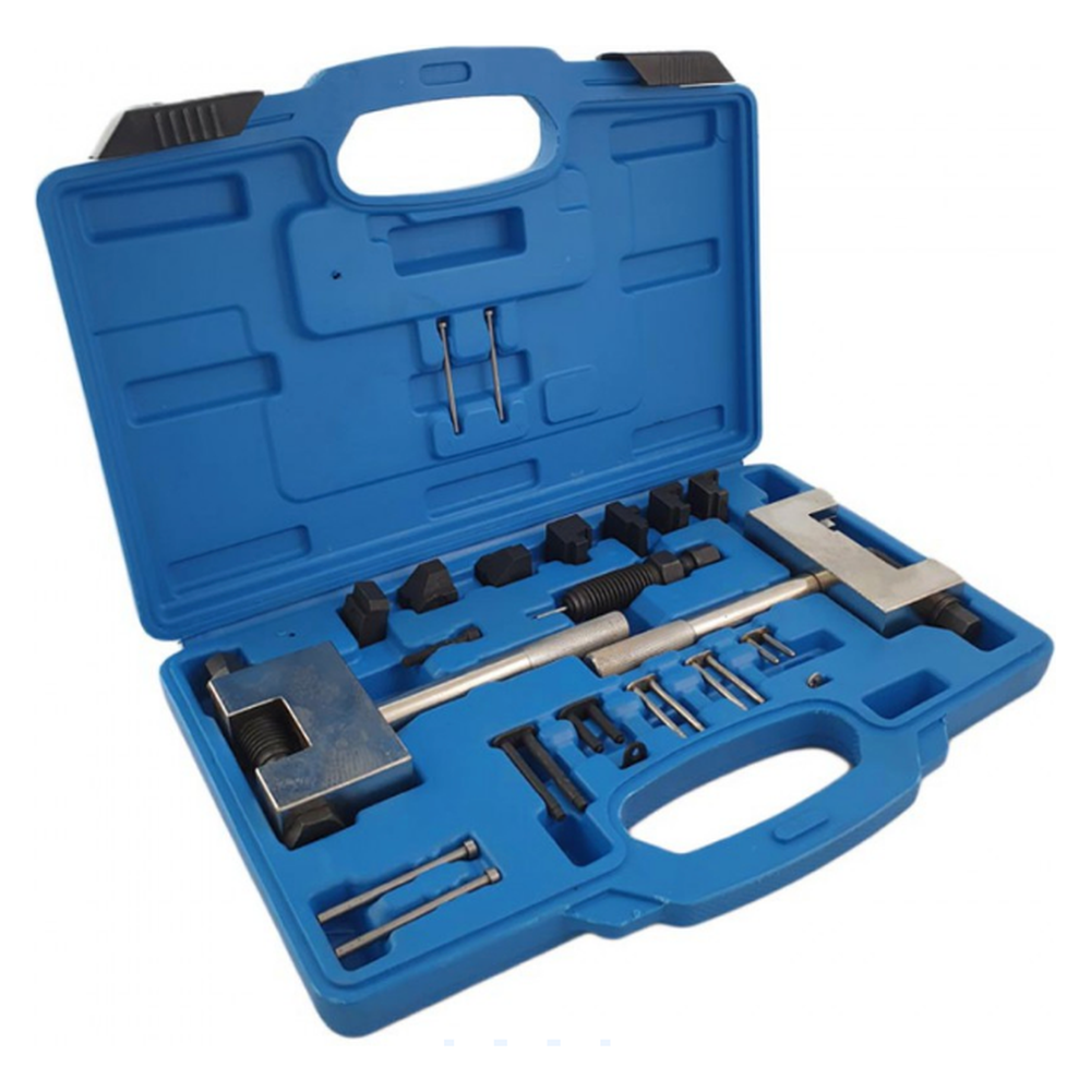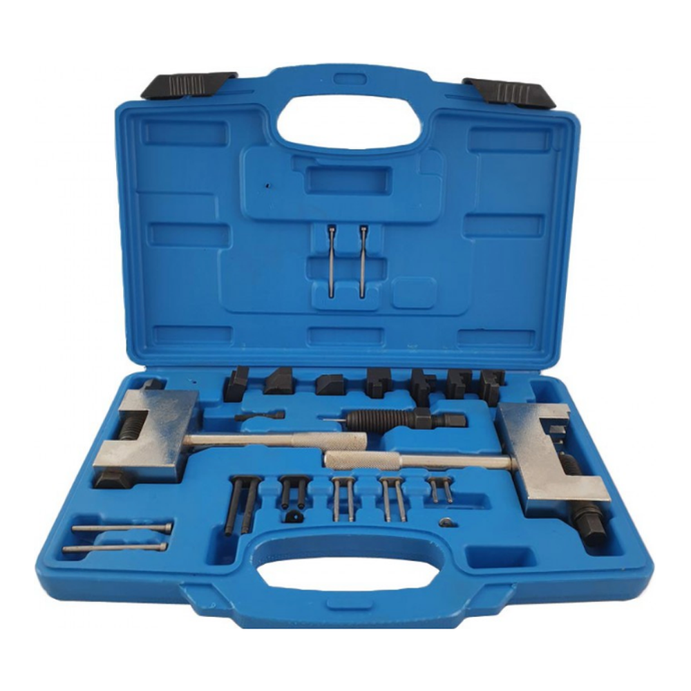 Deze set zorgt voor het splijten en aanbrengen van de distributieketting van de Mercedes-Benz modellen. Het gereedschap zorgt voor een snelle en eenvoudige demontage. Geschikt voor enkelzijdige en dubbelzijdige kettingen. Geschikt voor Simplex en Duplex ketting voor de meeste BENZ diesel en benzine motoren.