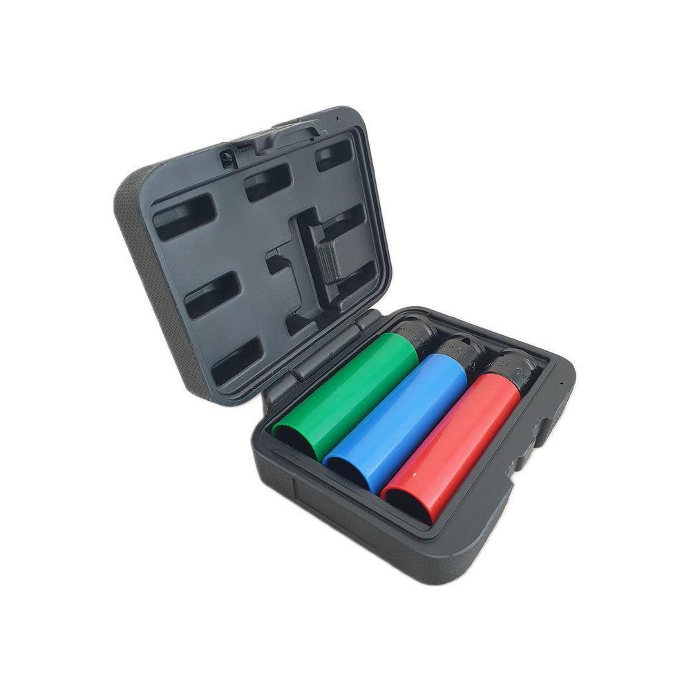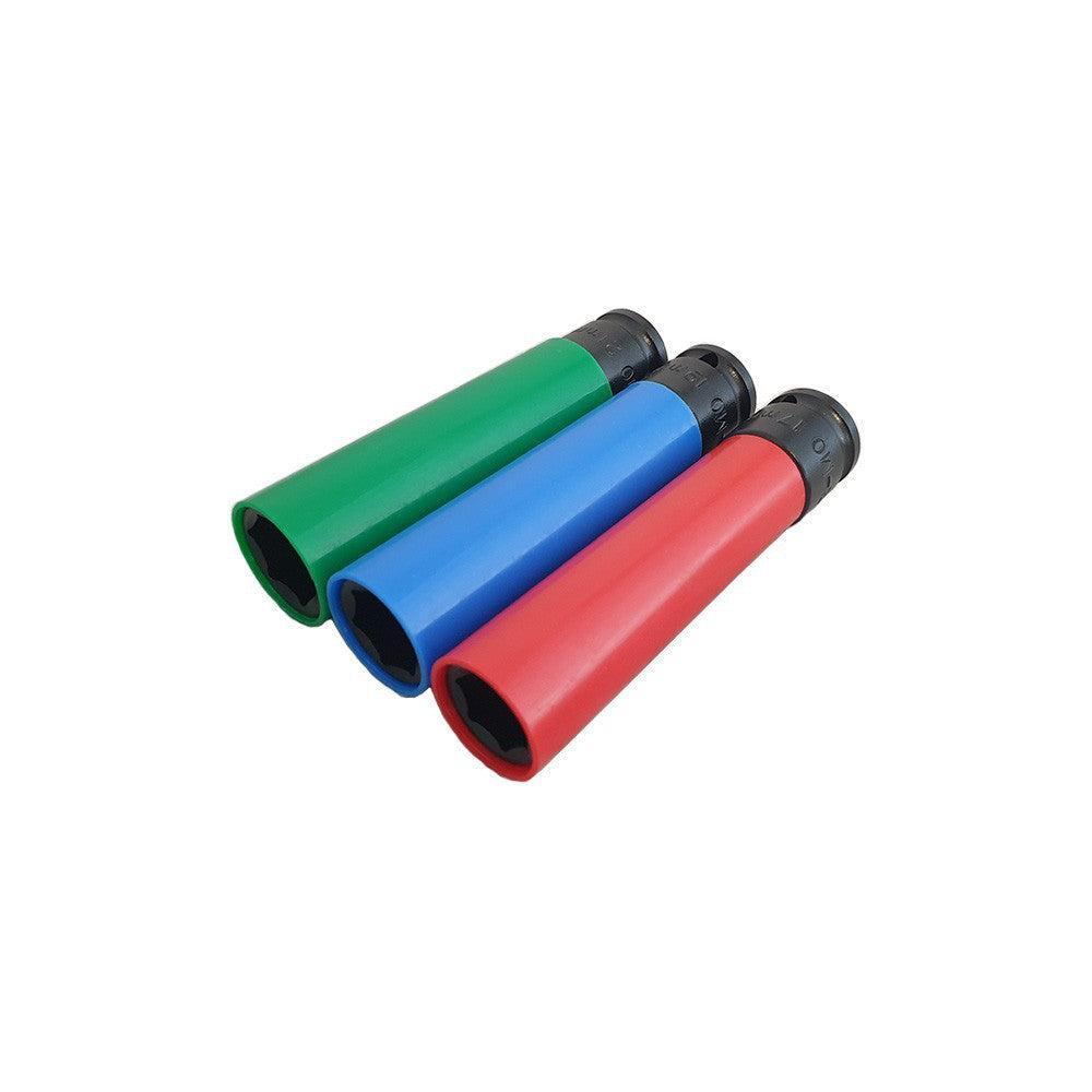 De krachtdoppen set extra lang bevat vier verschillende maten, elk voorzien van een kleurrijke nylon huls. Dit maakt het gemakkelijk om de juiste maat snel en efficiënt te selecteren. De set bevat de volgende maten: