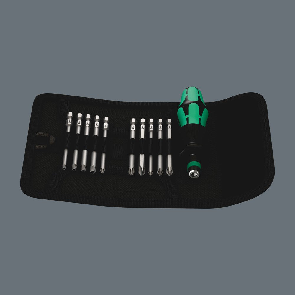 Vouwetui met 89 mm lange bits. Inclusief handhouder 816 R Kraftform met snelwisselfunctie 'Rapidaptor' en meerdelige Kraftform handgreep voor vermoeiingsarm werken.