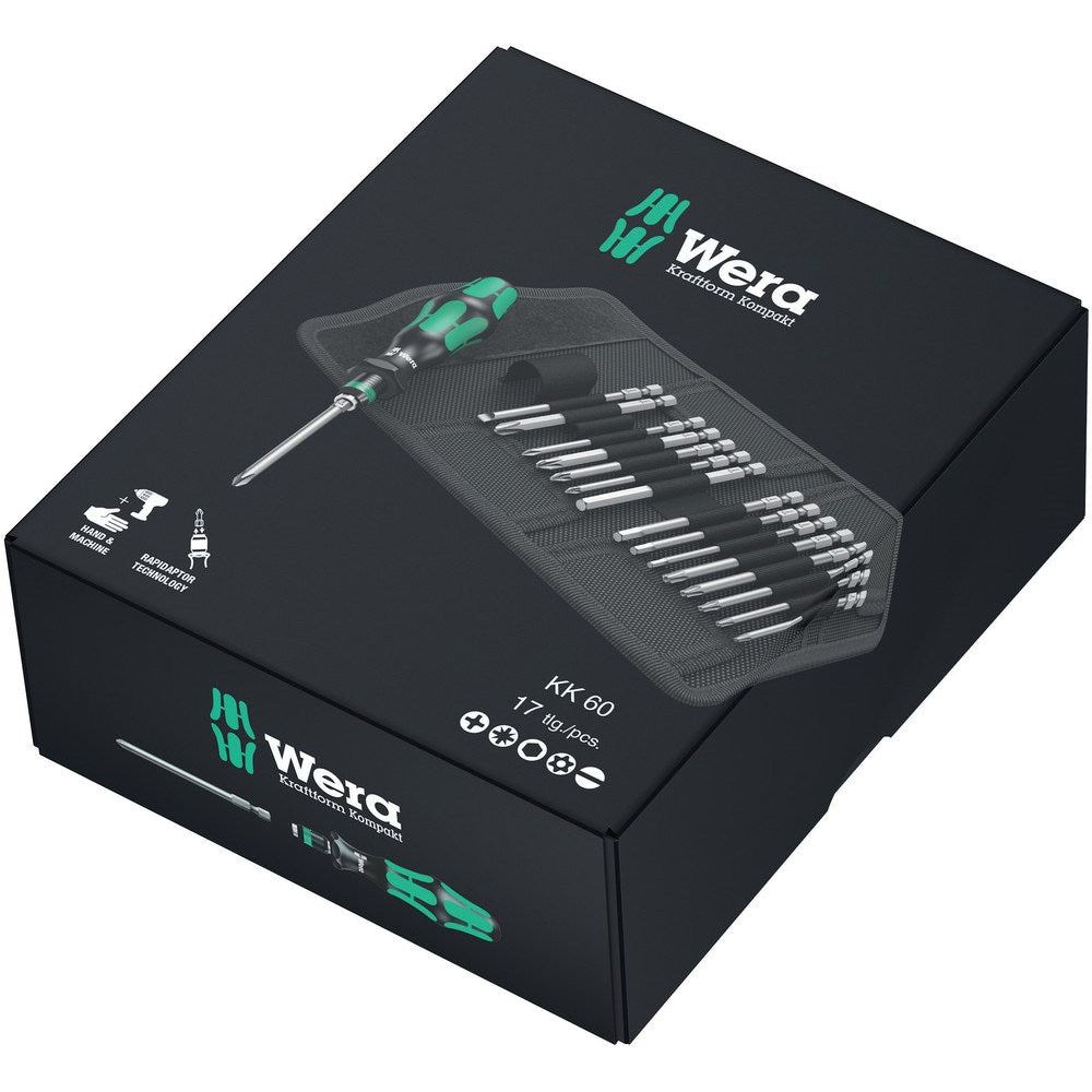 Vouwetui met 89 mm lange bits. Inclusief 816 R Kraftform handhouder met Rapidaptor snelwisselfunctie en meercomponenten Kraftform handgreep voor vermoeiingsvrij werken. Harde gripzones voor een hoge werksnelheid, zachte gripzones voor een hoge draaimomentoverbrenging. Geschikt voor handmatige en machinale schroefbewegingen. 17-delig.