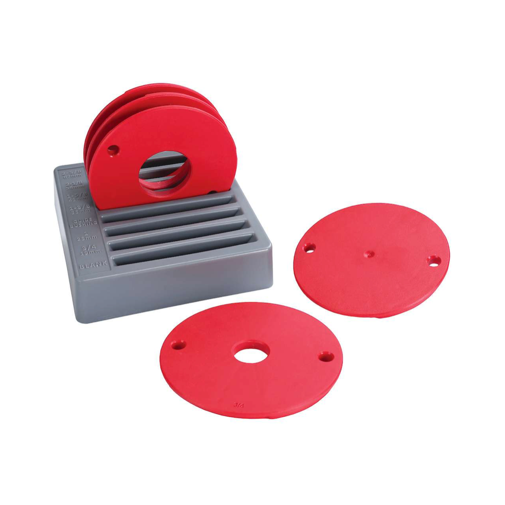 The set includes rings with 19mm, 35mm, 41mm, 54mm openings, plus one “blank” ring that you can use to create your own custom-sized or zero-clearance ring. The set comes with a molded storage tray that has slots to hold all five Level-Loc Reducing Rings, plus slots to hold the three rings that come with the Precision Router Table Insert Plate or Precision Router Table Lift. Each slot is marked with the opening size, making it easy to keep the rings organized.