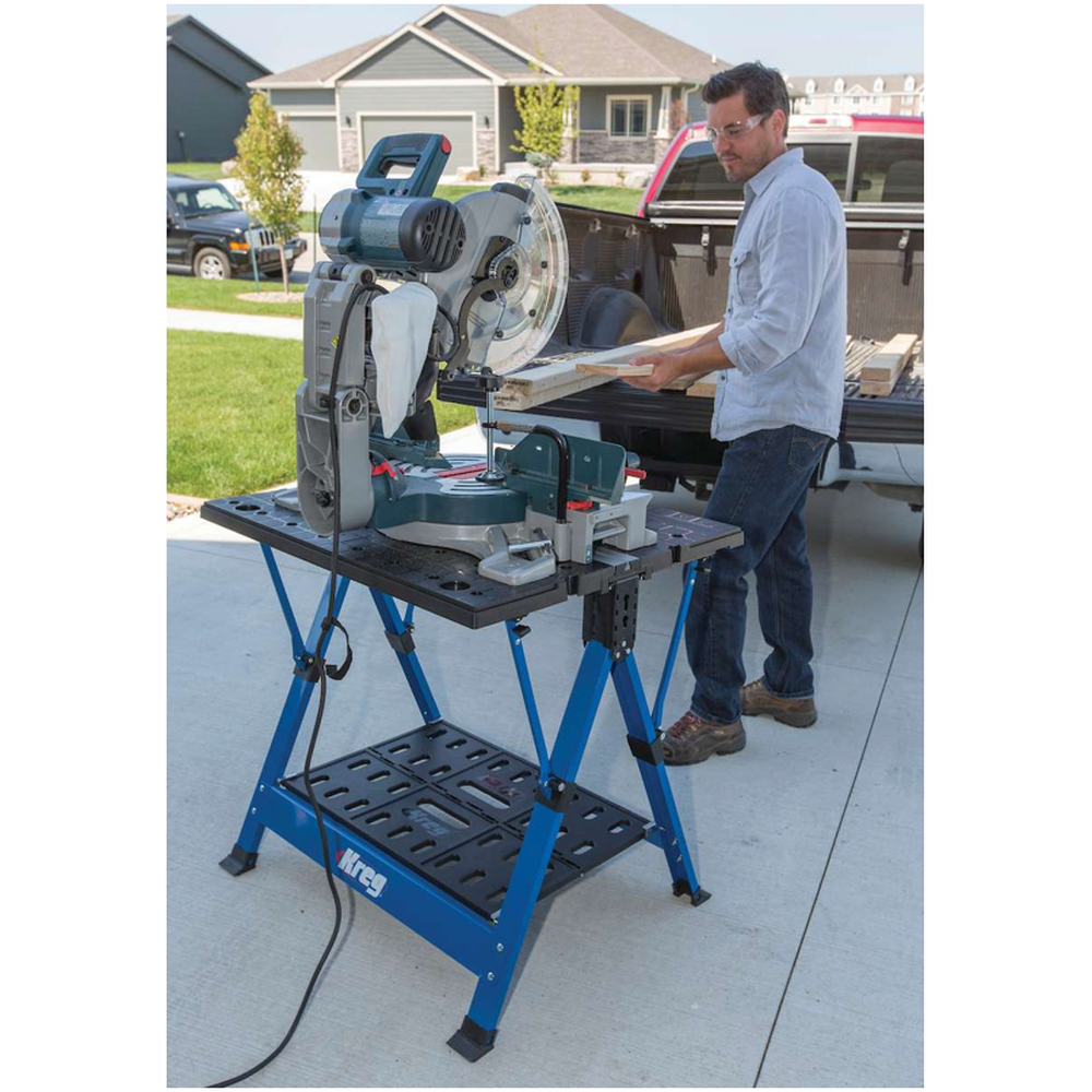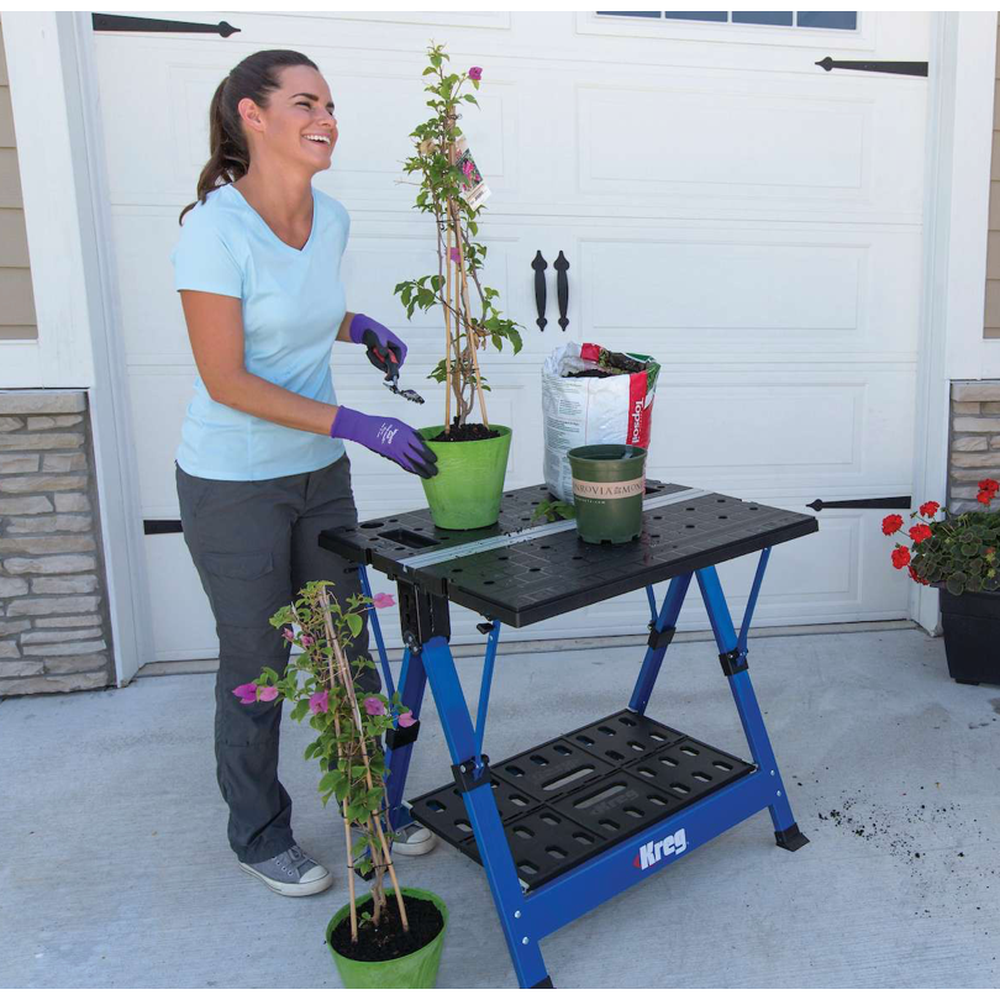The Clamp Trak and included Bench Clamp with Automaxx® Auto-Adjust Technology provide multiple ways to hold workpieces. The open tables can support up to 158kg (350 pounds), and have built-in storage trays, holsters for your drill, and more. A shelf underneath holds up to 11.3kg (25 pounds) of supplies and tools out of the way but close at hand while you work.