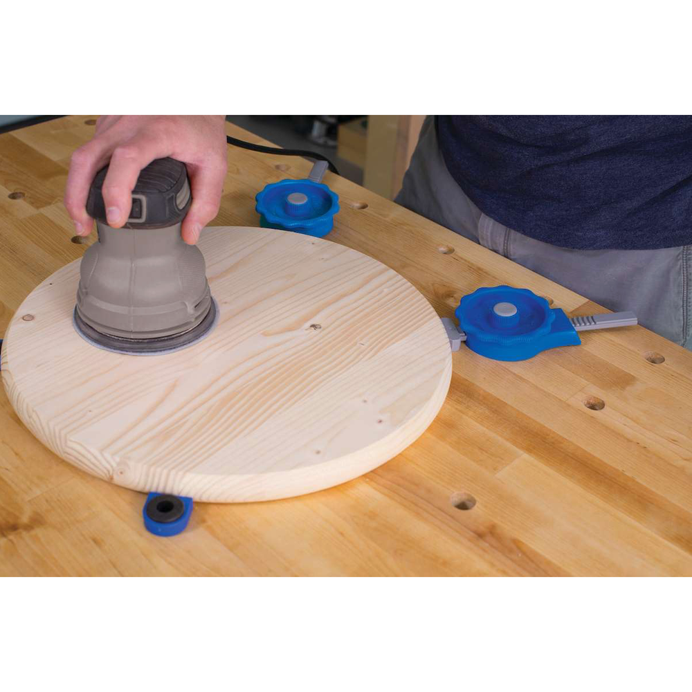 - Clamping Method Benchtop in-line clamping, peg fits standard 3/4" bench dog hole, swivels 360° to apply clamping force in any direction