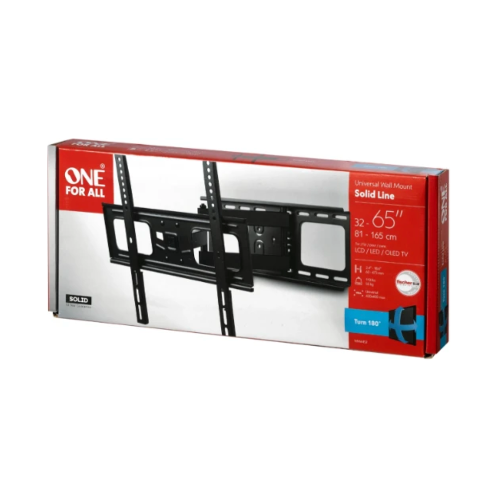Deze volledig bewegende One For All tv-beugel met draai- (180 °) en kantel- (15 °) aanpassing is geschikt voor televisies van 32 tot 65 inch en compatibel met VESA-formaten: 200 x 100, 200 x 200, 300 x 200, 300 x 300, 400 x 200, 400 x 300 en 400 x 400. Pas uw One For All Solid tv-beugel eenvoudig aan door hem tot 180 ° en tot 15 ° verticaal te draaien om de ideale kijkpositie te creëren, perfect geschikt voor tv's die moeten in een hoek worden geplaatst. Deze volledig bewegende One For All tv-beugel is zeer praktisch met een kabelopbergmogelijkheid om een strakke en overzichtelijke look te creëren. Alle bevestigingsmaterialen zoals schroeven, betonankers en afstandhouders worden met de muurbevestiging meegeleverd voor een snelle en ongecompliceerde installatie. Je kunt ook de gratis One For All-app downloaden, boordevol handige installatietools. De One For All tv-beugels werken met alle soorten tv's van elk merk. De SOLID-serie tv-beugels heeft een robuust ontwerp dat zorgt voor een optimale ondersteuning van uw tv.