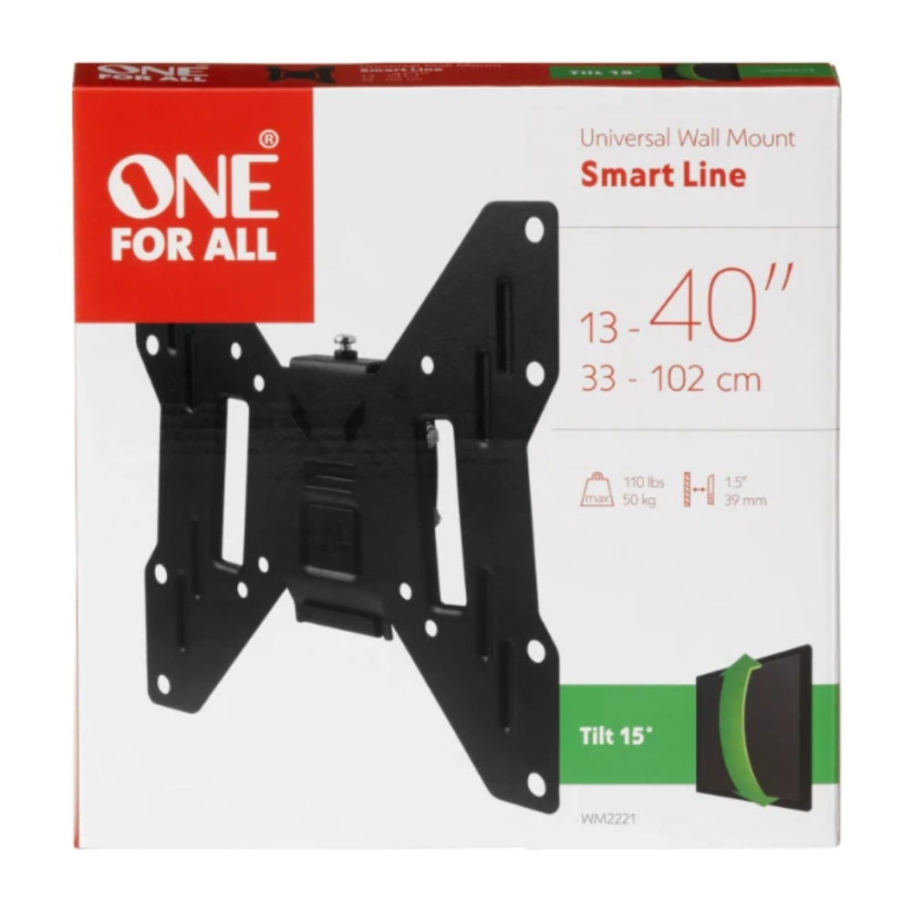 Deze One For All-beugel is geschikt voor televisies van 13 tot 40 inch en compatibel met VESA-formaten: 75 x 75, 100 x 100, 200 x 100 en 200 x 200. VESA is een standaard die de afstand aangeeft tussen de gaten in de achterkant van uw tv. Controleer de VESA-grootte van uw televisie om compatibiliteit te garanderen. Kantel uw tv tot 15 ° naar voren of achteren om reflecties van zonlicht of weerkaatsingen van binnenverlichting tegen te gaan en de ideale tv-kijkervaring te creëren. br> Alle bevestigingsmaterialen worden geleverd voor een snelle en eenvoudige installatie. Je kunt ook de handige One For All-app downloaden met tools zoals een waterpas en flitslicht, waardoor een snelle en eenvoudige installatie mogelijk is. Beschikbaar voor iOS en Android. De One For All tv-beugels werken met alle soorten tv's van elk merk.