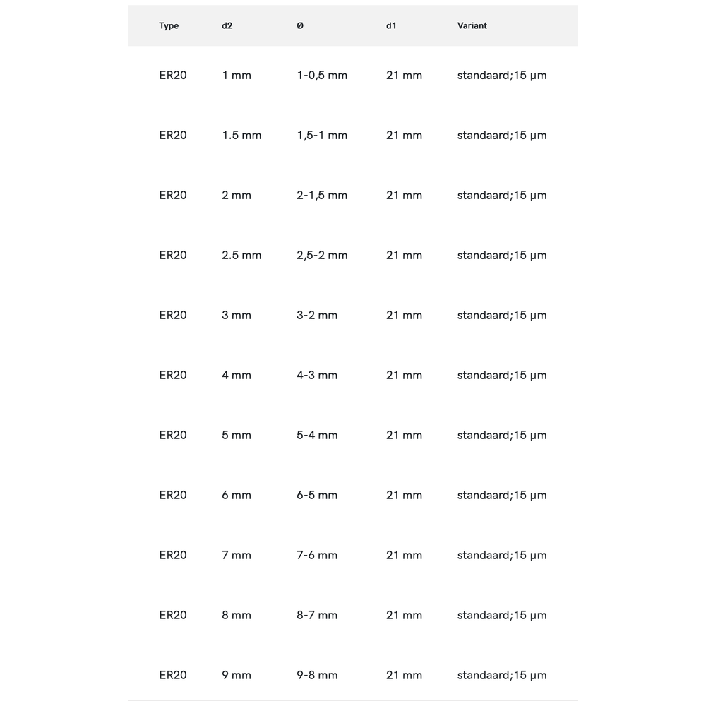Of je nu werkt met staal, aluminium of kunststof, de Phantom spantang garandeert optimale prestaties en een uitstekende grip. Met een standaardmaat van ER 20 en een nauwkeurigheid van slechts 15 µm, kun je erop vertrouwen dat jouw gereedschappen perfect op hun plaats blijven zitten, zelfs onder de meest uitdagende omstandigheden.