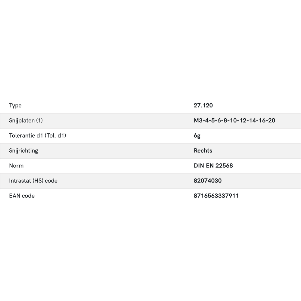 Het "Phantom Set Snijplaten DIN EN 22568 27.120 - M3 - M20" biedt een breed scala aan mogelijkheden. Met maten variërend van M3 tot M20, heb je altijd de juiste snijplaat bij de hand voor jouw specifieke behoeften. Deze snijplaten zijn vervaardigd volgens de strenge normen van de DIN EN 22568, wat betekent dat je kunt rekenen op een uitstekende pasvorm en een lange levensduur. Ze zijn perfect voor het snijden van schroefdraad in diverse materialen, waaronder staal, aluminium, en kunststoffen.