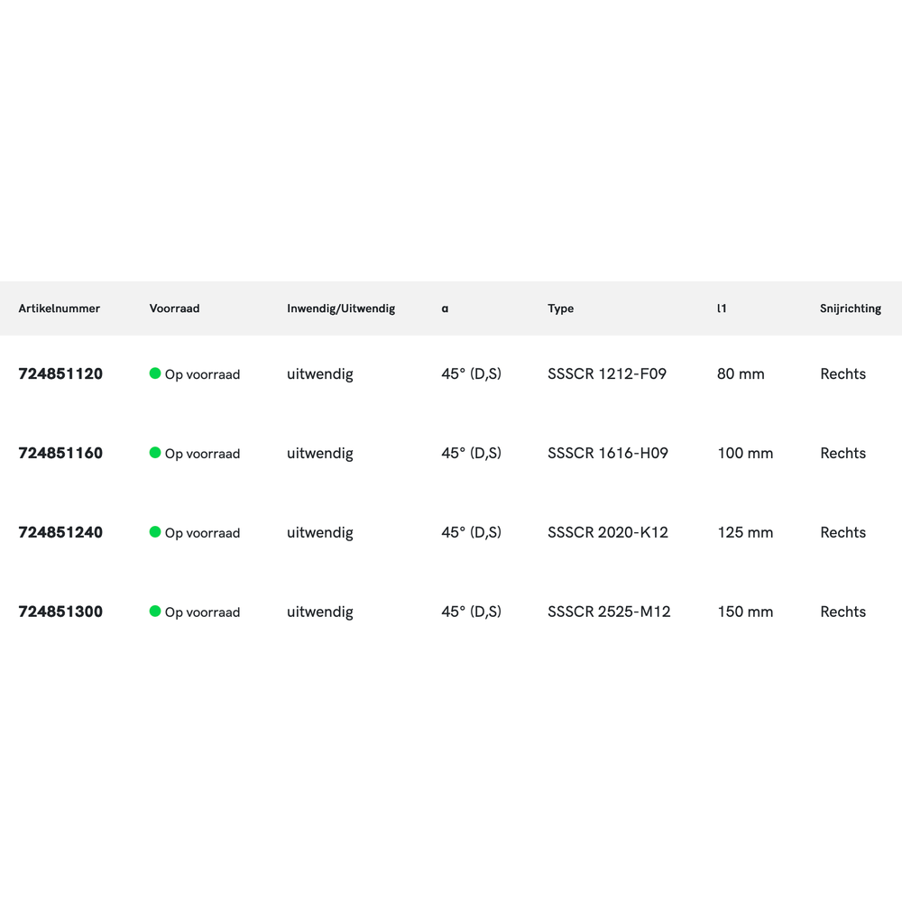 Vergeet niet uw wisselplaten te bestellen om optimaal gebruik te maken van deze hoogwaardige wisselplaathouder. Kies uit ons assortiment Phantom hardmetaal wisselplaten SCMT UNI, SCMT Staal of SCGT ALU voor de beste prestaties, afhankelijk van uw specifieke toepassingen. Met de Phantom Wisselplaathouder, 45° SSSCR in uw gereedschapskist bent u verzekerd van een solide en betrouwbare partner voor al uw verspaningswerkzaamheden. Maak vandaag nog de stap naar een efficiënter productieproces en ervaar zelf de voordelen van Phantom!