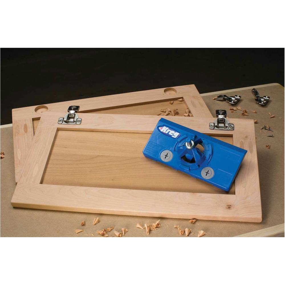 Concealed hinges are great for mounting cabinet doors because they stay out of sight, they’re adjustable, and they work very well. Mounting them, though, requires drilling a large hole at a very specific position and depth. The Kreg Concealed Hinge Jig takes the guesswork out of drilling those holes, and allows you to do it with nothing more than a drill and the carbide-tipped bit that comes with the jig.