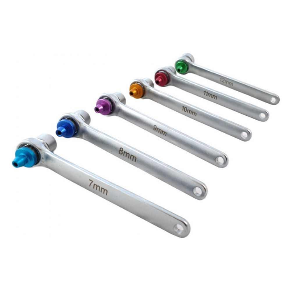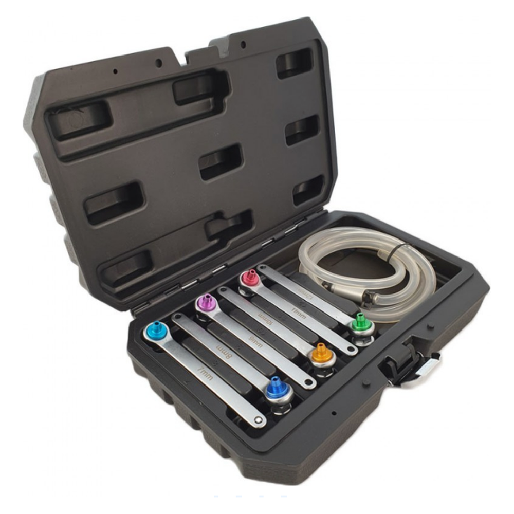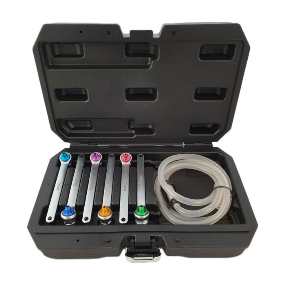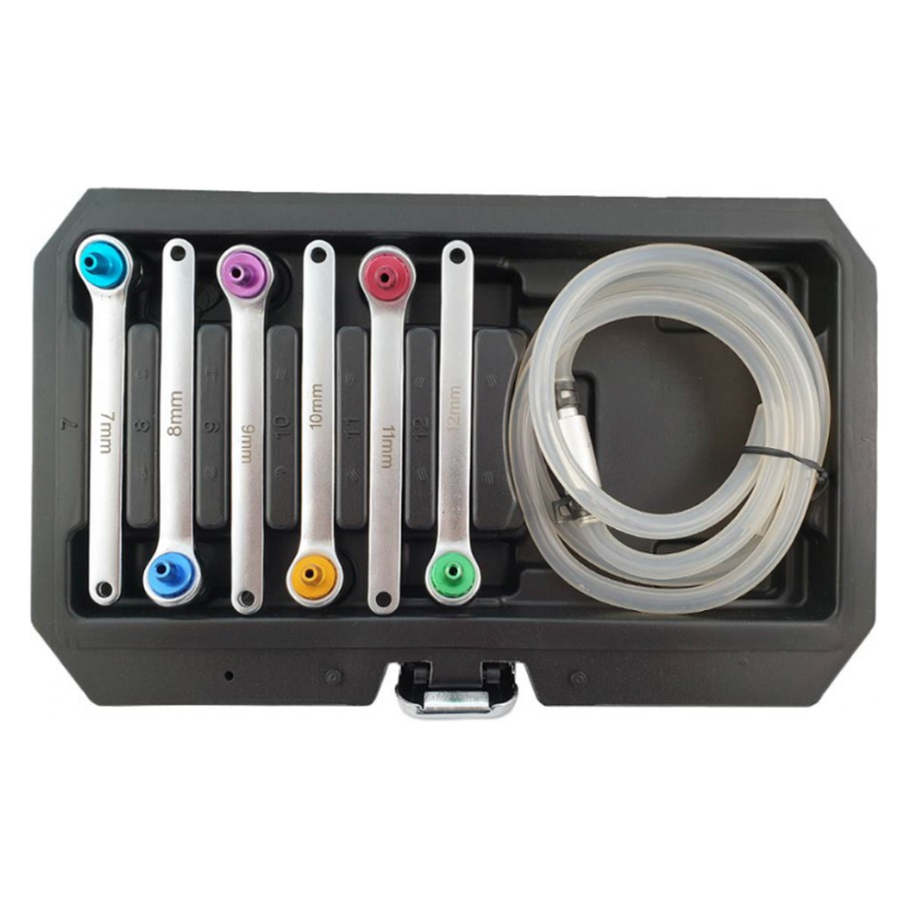 Met een assortiment van 12-kant sleutels, gecodeerd in verschillende kleuren, kunt u eenvoudig de juiste maat selecteren voor elke klus. De sleutels zijn verkrijgbaar in maten van 7 tot en met 12 mm, zodat u altijd de juiste gereedschap heeft bij de hand. Deze veelzijdigheid maakt onze set ideaal voor het ontluchten van remsystemen en het efficiënt ontluchten van hydraulische koppelingen, zonder dat u de wielen hoeft te demonteren. Dit bespaart niet alleen tijd, maar ook moeite.