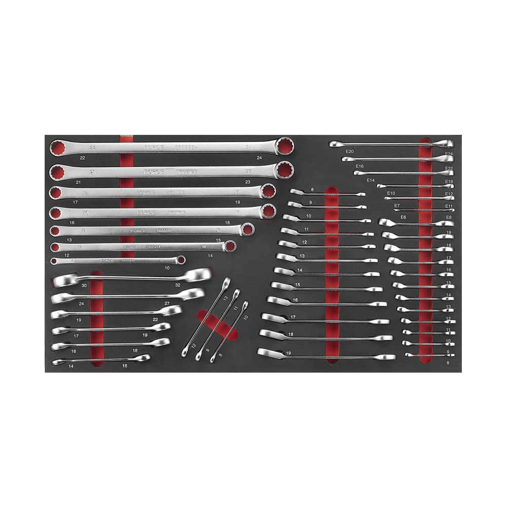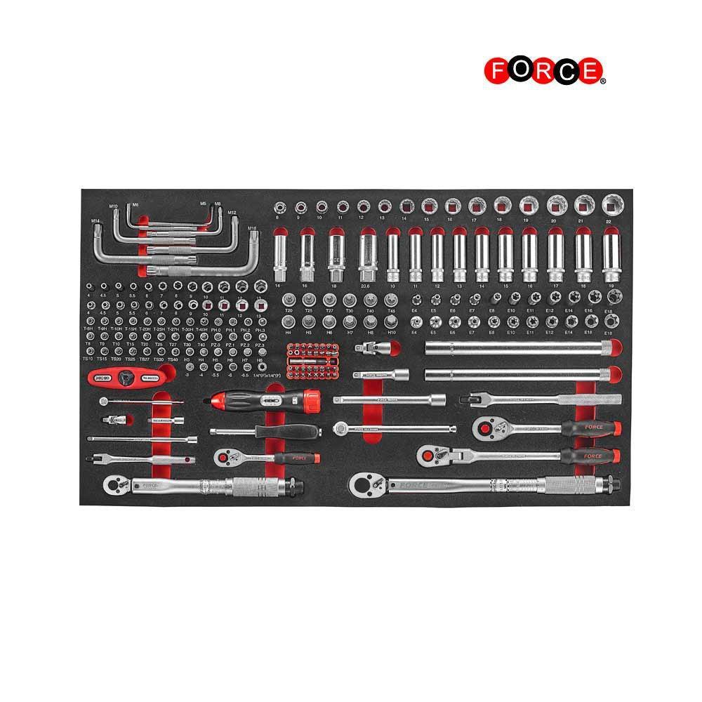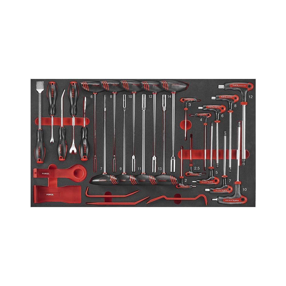 Het gereedschap is verwerkt in 8 Foam-inleg trays gemaakt van olie en benzinebestendige foam met precies uitgesneden gereedschap-inlegvormen. Dit systeem is prettig om mee te werken omdat ieder gereedschap zijn eigen unieke inlegvorm heeft en door de tweekleur is het altijd goed zichtbaar op welke plek een stuk gereedschap ontbreekt.