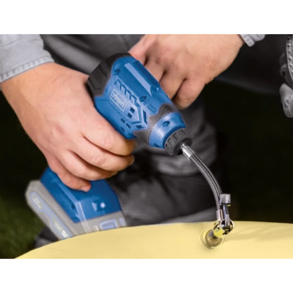 Scheppach mobiele accu compressor C-AC20-X is met zijn maximale werkdruk van 7 bar een handige en krachtige hulp voor onderweg en ideaal voor het oppompen van fietsbanden, ballen en luchtbedden. Het LCD-display toont de huidige en vooraf ingestelde werkdruk in bar of PSI. Als de vooraf ingestelde druk is bereikt, schakelt de handcompressor automatisch uit (auto shut-off).