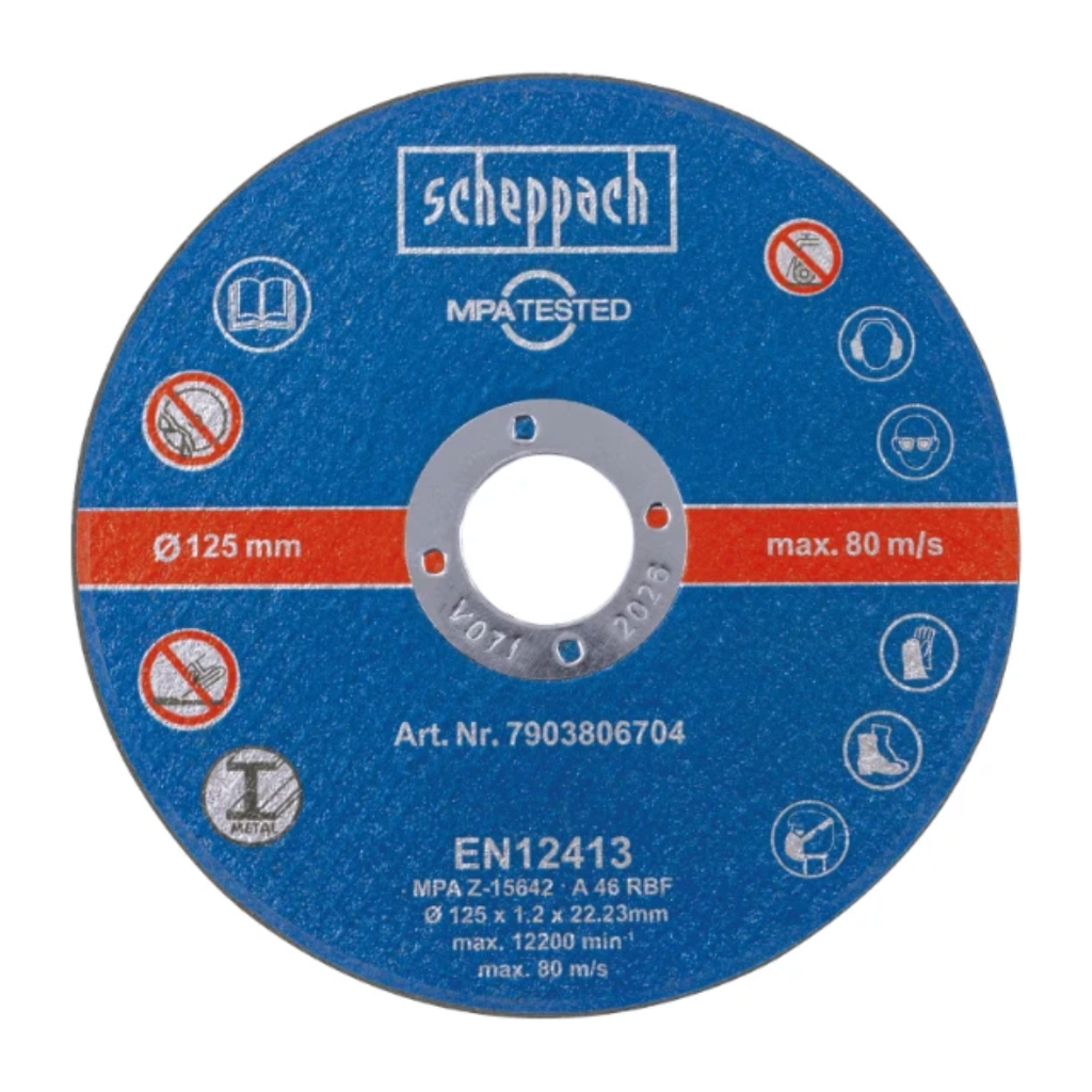 Scheppach doorslijpschijf geschikt voor het slijpen en snijden van metaal. De slijpschijf heeft een diameter van 125 mm en een asgat van 22,23 mm. Het maximum toerental van de slijpschijf bedraagt 12200 min-¹. Wordt geleverd in een verpakking van 12 stuks.