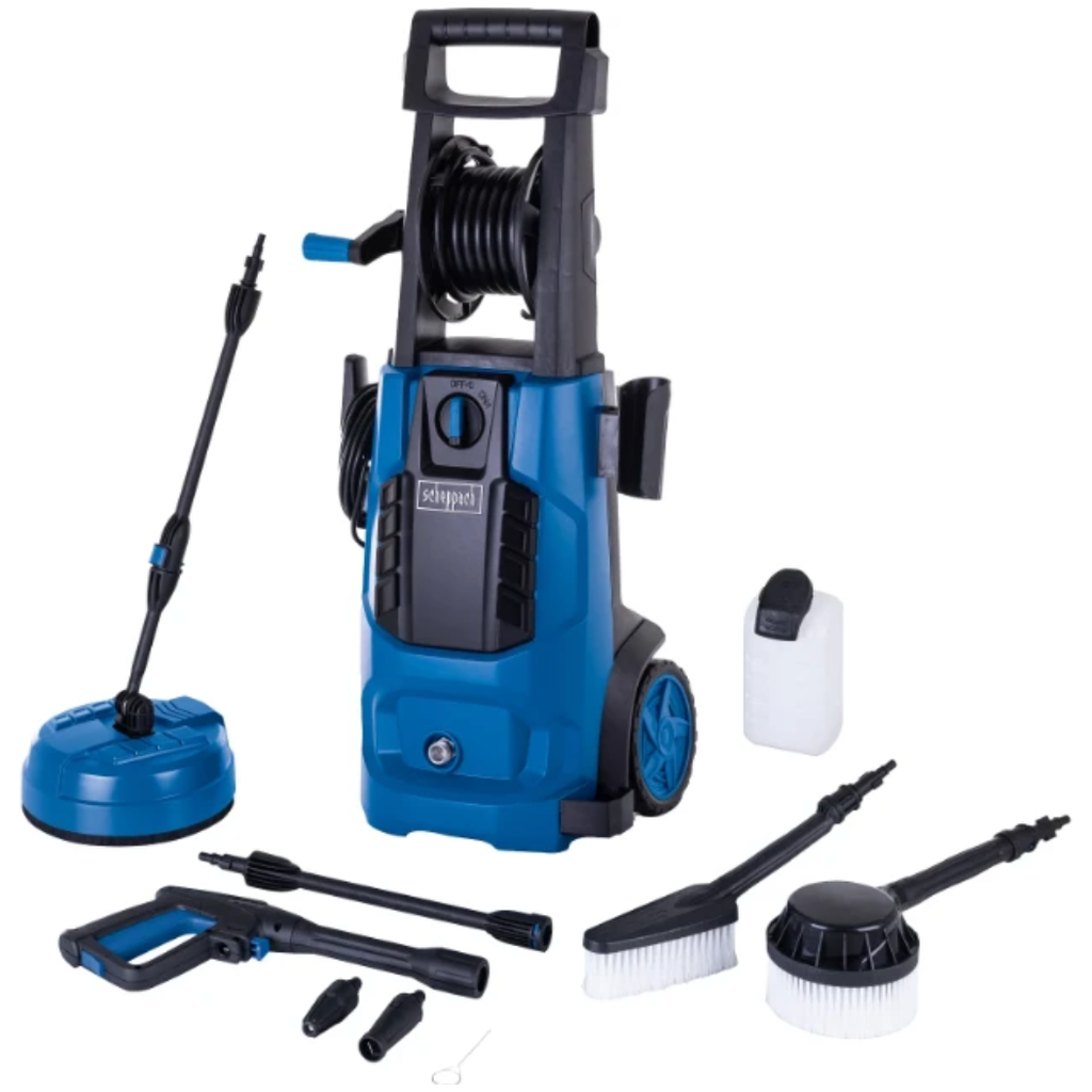Scheppach hogedrukreiniger HCE2800 is een betrouwbare hulp voor thuis, op de boerderij of op de bouwplaats. De krachtige 2400 Watt motor genereert een maximale werkdruk van 180 bar en verwijdert daarmee ook hardnekkige vuil, alg of mos van paden, terrassen, voertuigen en tuinmeubelen. Het automatisch in- en uitschakelen van de motor vermindert bovendien het water- en energieverbruik. De tuinslang kan eenvoudig aan de geïntegreerde slanghaspel worden opgeborgen.