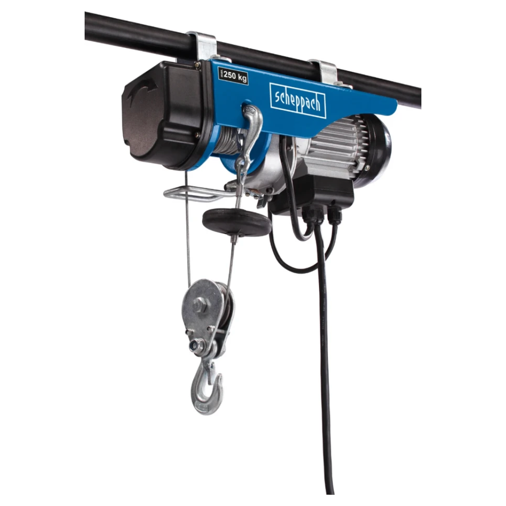Scheppach elektrische katrol HRS250 maakt het mogelijk om veilig lasten in huis, het erf, de werkplaats of in de tuin te heffen. Vanwege de stevige staalkabel kunnen lasten tot 125 kg worden gehesen. De veiligheidshaak voorkomt bovendien dat ladingen wegglijden. Extra veiligheid is aanwezig in de vorm van een noodstopschakelaar. Deze zorgt voor een onmiddellijke uitschakeling en garandeert een veilige werkomgeving.