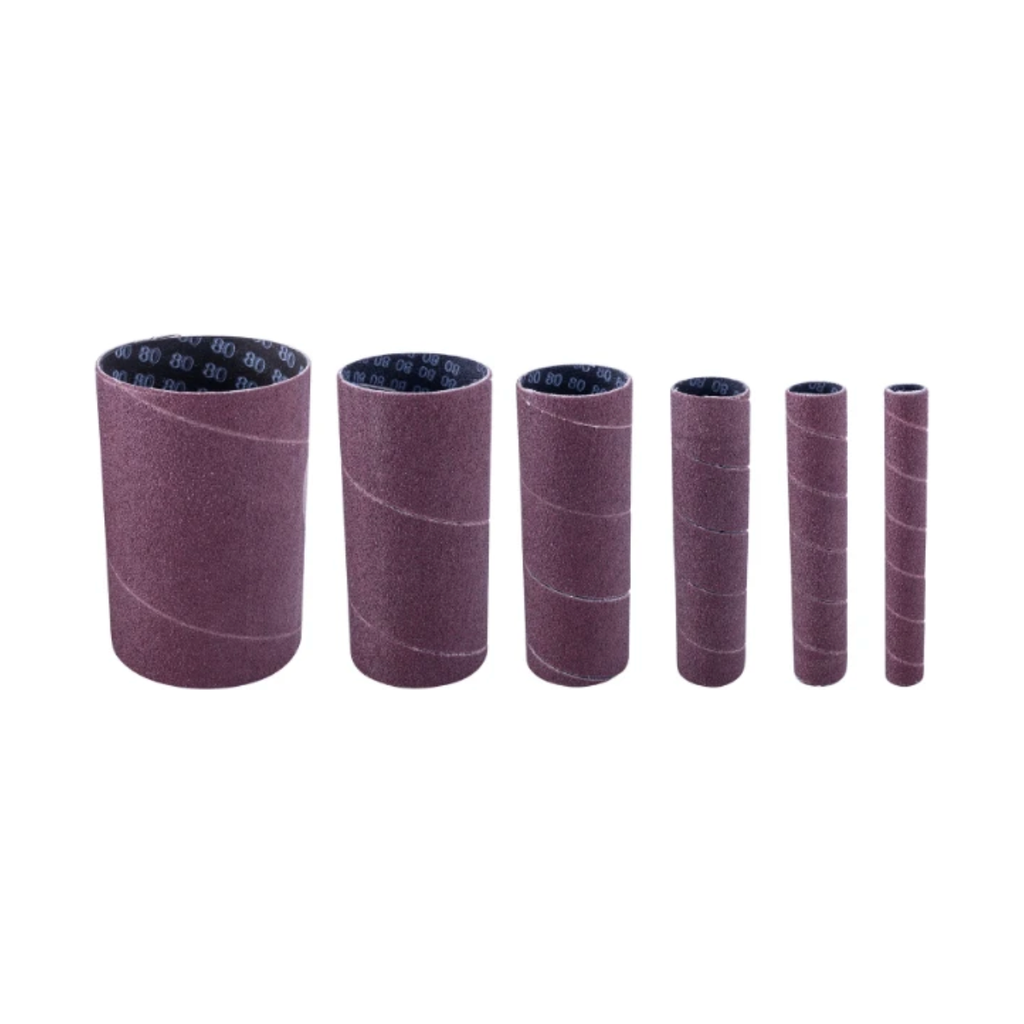 Scheppach schuurrollenset in korrelgrootte K120. De kokers hebben verschillende diameters. Ø13, Ø19, Ø26, Ø38, Ø51 en Ø76 mm.