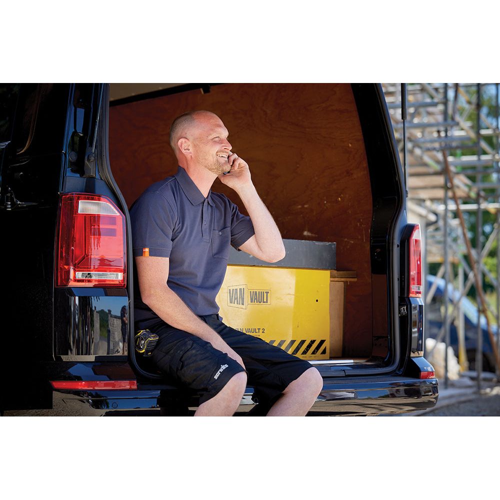 Ademende en duurzaam verkregen katoen-rijke stof. Langere ontwerp om opbollen tijdens het werk te voorkomen. Geribde kraag met knoopsluiting. Blanco borst voor bedrukking of borduring. 50 % uit duurzame bosbouw en 50 % polyester, 220 g/m².