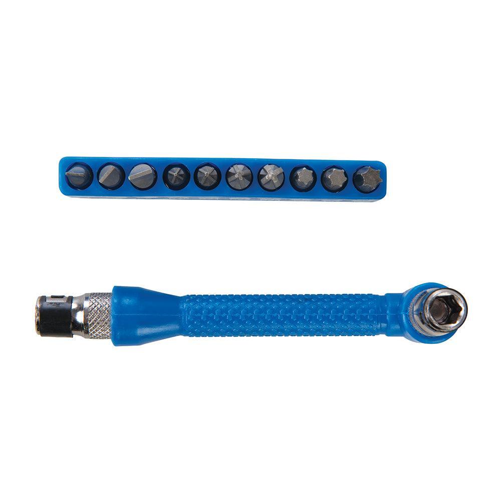 De lengte van 105 x 30 mm en de 6 mm (1/4") zeskant bithaak aan beide uiteinden maken deze set veelzijdig en geschikt voor verschillende schroeftoepassingen. De set omvat niet alleen de drijfstang en de bithouder, maar ook 10 hoogwaardige zeskantbits die zijn ontworpen voor nauwkeurigheid en duurzaamheid. U ontvangt sleufbits van 4, 5, en 6 mm, evenals kruiskopbits van PZ1, PZ2 en PZ3, en Torx bits van T25, T27 en T35.