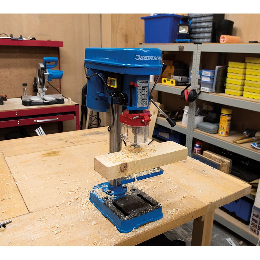 Met riemaandrijving met 5 snelheden. Boorhouder/spindel slag 0-50 mm met schaalaanduiding voor nauwkeurig boren. Sterke gegoten voet en machinetafel. 13 mm boorkop met sleutel.