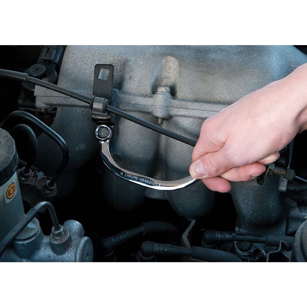 C-vormige sleutels voor het gebruik op moeilijk bereikbare plekken. Gehard en hoogwaardig gepolijst chroom vanadium staal. De sleutels worden in een sterke opbergetui verstrekt. Inbegrepen maten: 8 x 10, 11 x 13, 14 x 15, 17 x 19, 21 x 22 mm.