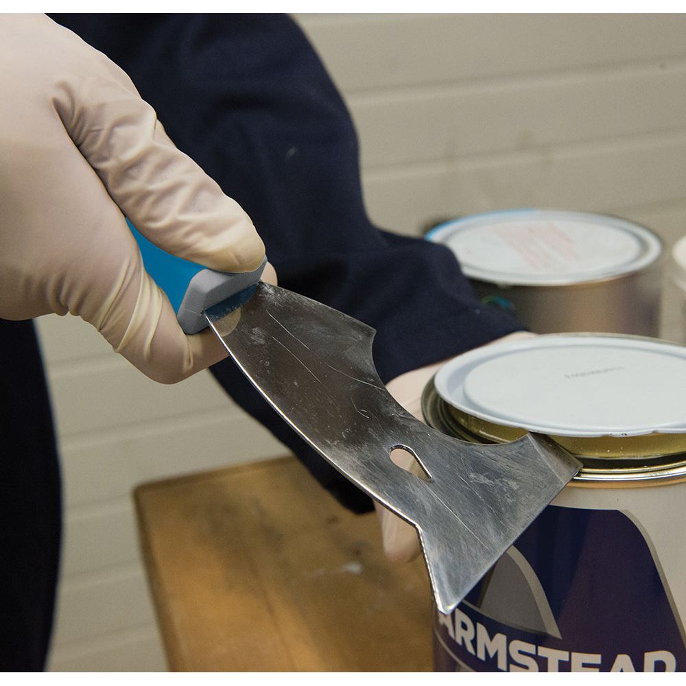 Multifunctionele schraper, inclusief spijker verwijderklem, 45° en 90° bladen, rond blad voor het schoonmaken van verfrollers en metalen dop voor het verzakken van gipsplaat spijkers. 2-kleurig, soft-grip handvat. Hanggat.