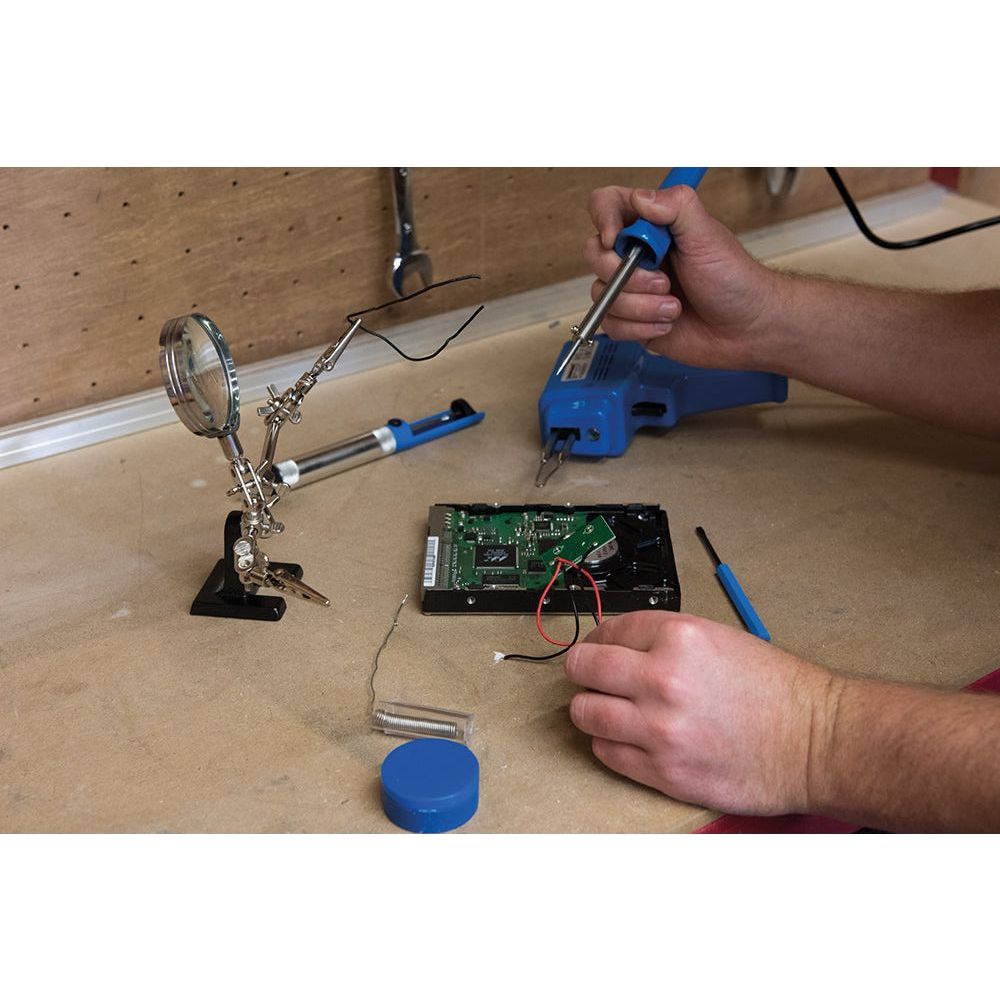 Derde hand voor het vastklemmen van voorwerpen bij montage, solderen en verven. Wordt gebruikt bij model bouwen, elektronica en knutselen. Inclusief 2 verstelbare armen met sterke klemmen en een zware voet voor stabiliteit. Lens 63 mm 2,5x vergrotend, H x L x B: 170 x 185 x 49 mm. Gewicht 0,3 kg.