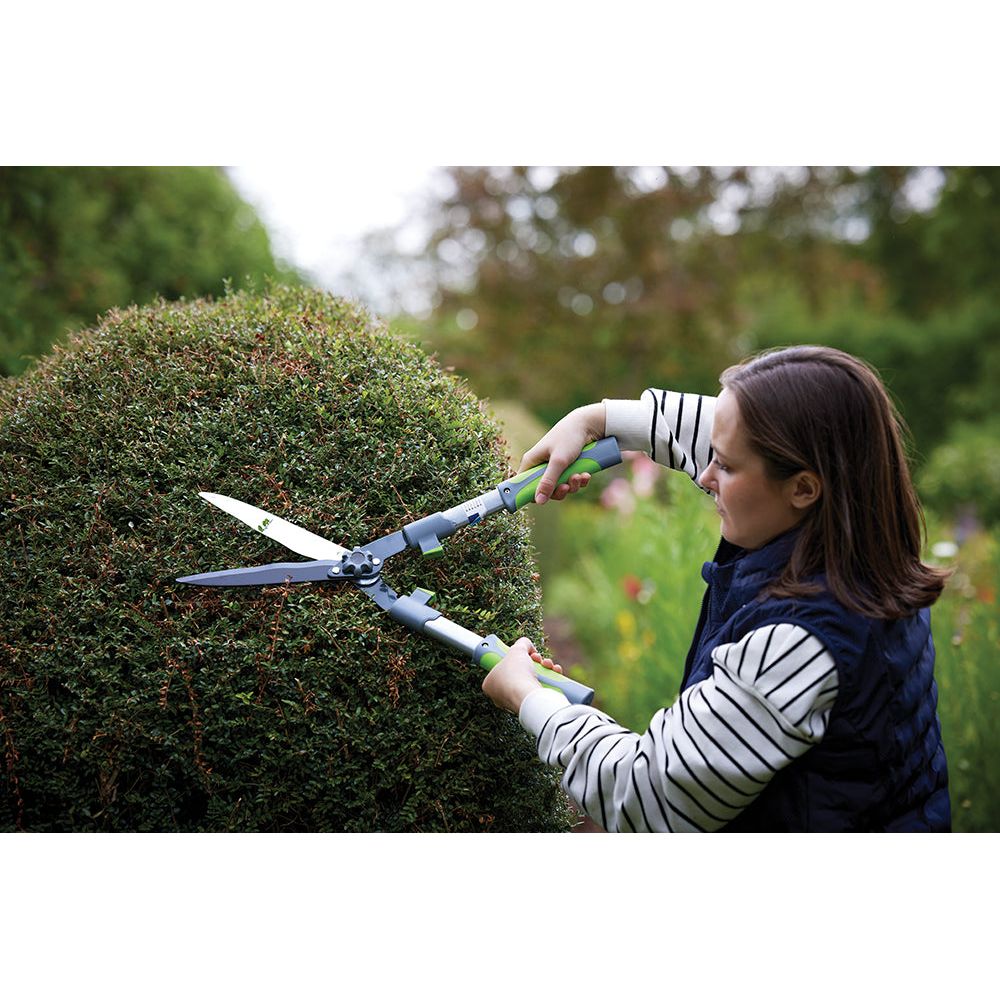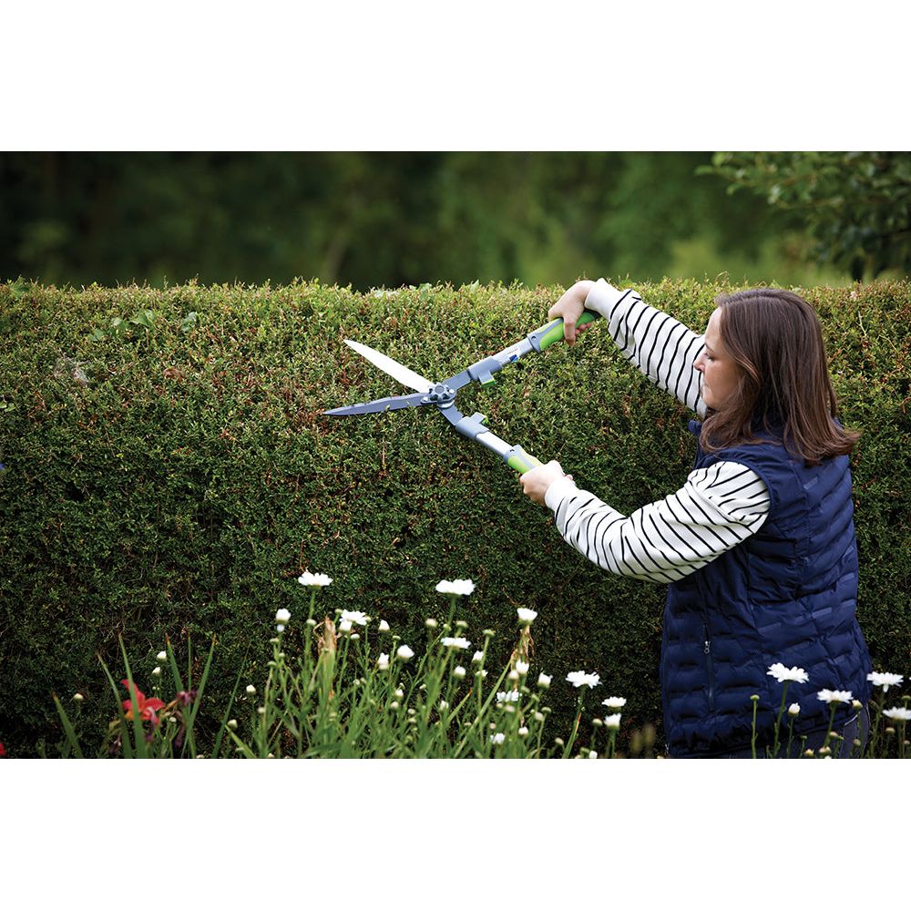Met zijn sterke bladen biedt deze heggenschaar indrukwekkende prestaties bij het snoeien van dikkere takken en dichte begroeiing. De bladen zijn voorzien van een niet-klevende coating, waardoor het gemakkelijker is om door takken te snijden zonder dat er sap of ander vuil aan blijft plakken. Dit niet alleen verlengt de levensduur van de schaar, maar zorgt ook voor een efficiënter en schoner snoeiresultaat.