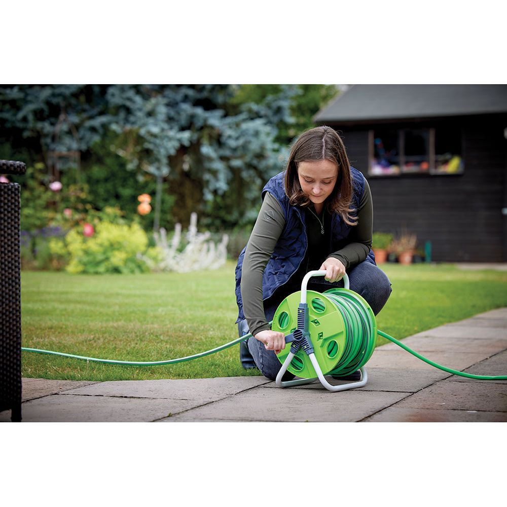 De geïntegreerde draaggreep zorgt ervoor dat je de slanghaspel moeiteloos kunt vervoeren, terwijl de continue stroomtechnologie betekent dat je nooit meer hoeft te worstelen met een verwarde slang. Dankzij de draaibare verbindingspen wordt het verwringen van de slang tot een minimum beperkt, wat bijdraagt aan een soepele werking en handig opbergen van de slang na gebruik.